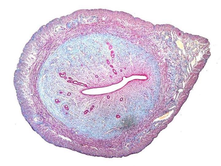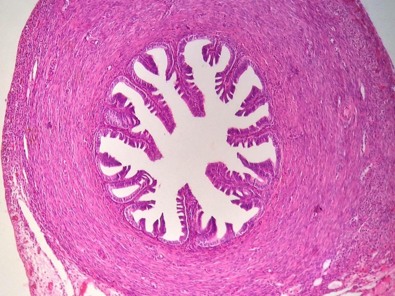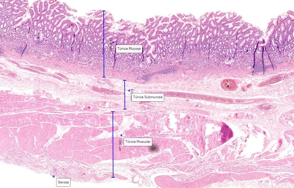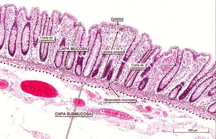 - Su lámina propia, muscularis mucosae y submucosa son parecidas a la del intestino delgado