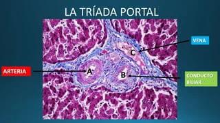 - Conducto biliar: formado por células cúbicas o prismáticas que están rodeadas de tejido conectivo