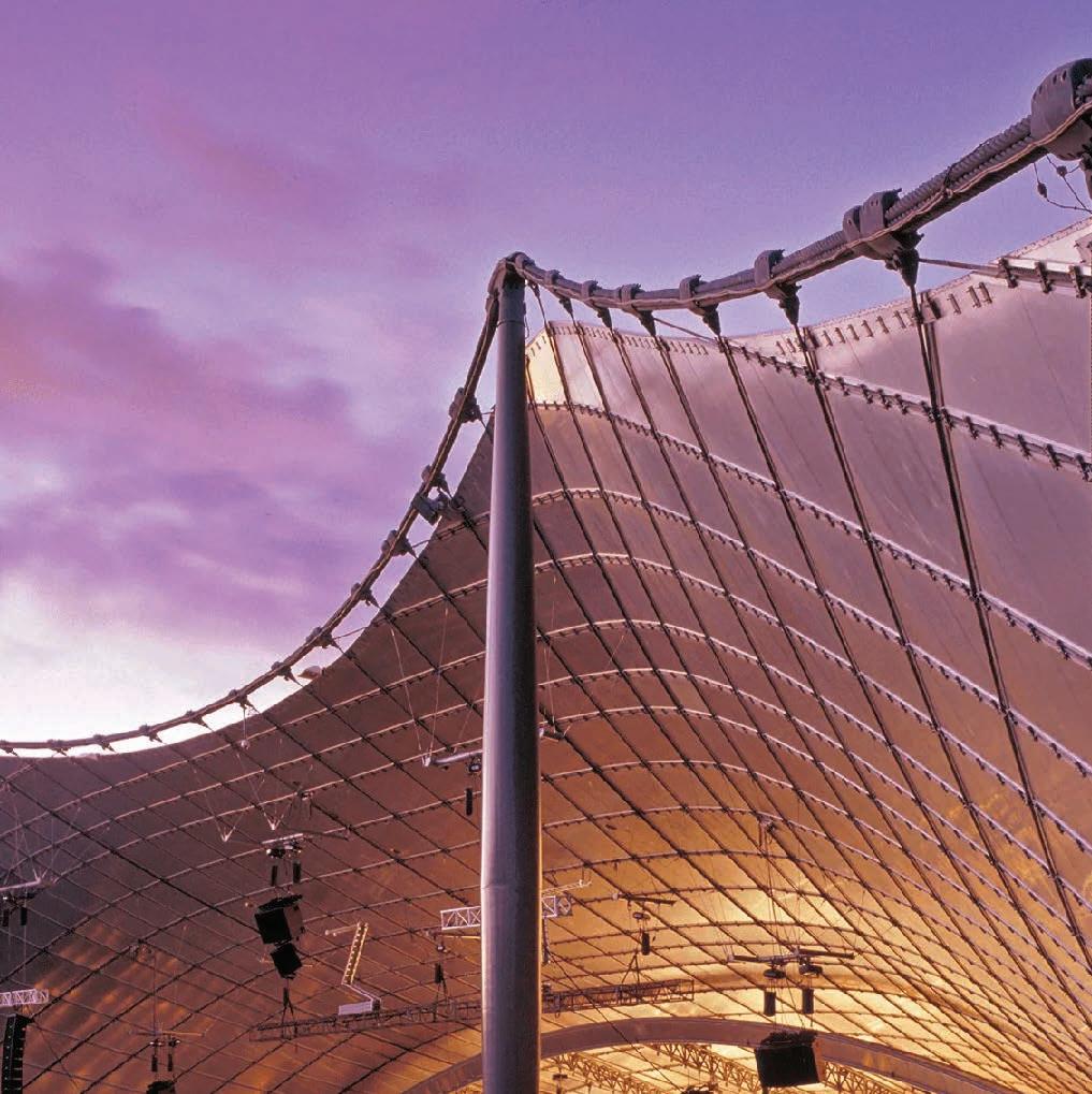 It is an auditorium so simple that you are apt to forget the technicalities and the wealth of scientific material that went to make it possible. It seems almost as if a silver scarf had floated down to earth and been tied by three corners to the ground. Or as if a giant had arrived from Mars and left a gleaming parachute on the lawn.