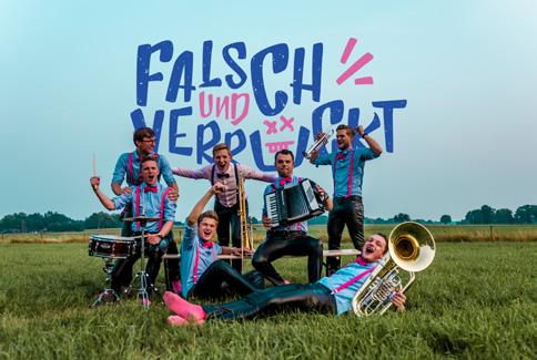 Deze zevenkoppige feestband, Falsch und Verrückt, heeft zijn oorsprong enkele kilometers van de Duitse grens gevonden. Dit houdt ze echter niet tegen om de ‘Stimmungsmusik der Heimat’ te laten klinken op verschillende podia in Nederland. Daarnaast zijn de Duitse klanken, afgewisseld met (falsche) meezingers en (verrückte) classics, niet het enige wat opvalt; met hun blauw-roze outfit geven ze een nieuwe dimensie aan de Lederhosen. Met een wervelwind aan energie zorgen ze voor een ware ‘Bombestimmung und Ambiance’.