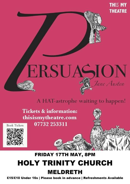 We have booked the This Is My Theatre group to perform Persuasion by Jane Austen in the main church. This promises to be a very entertaining evening by the group. The show itself is an 80-minute production. There will be a good opportunity to meet friends and socialise before and after the show, as we will have a licensed bar serving refreshments. Tickets are now on sale on the TIMT website at https://www.thisismytheatre.com/meldreth. Please contact me with any questions.
