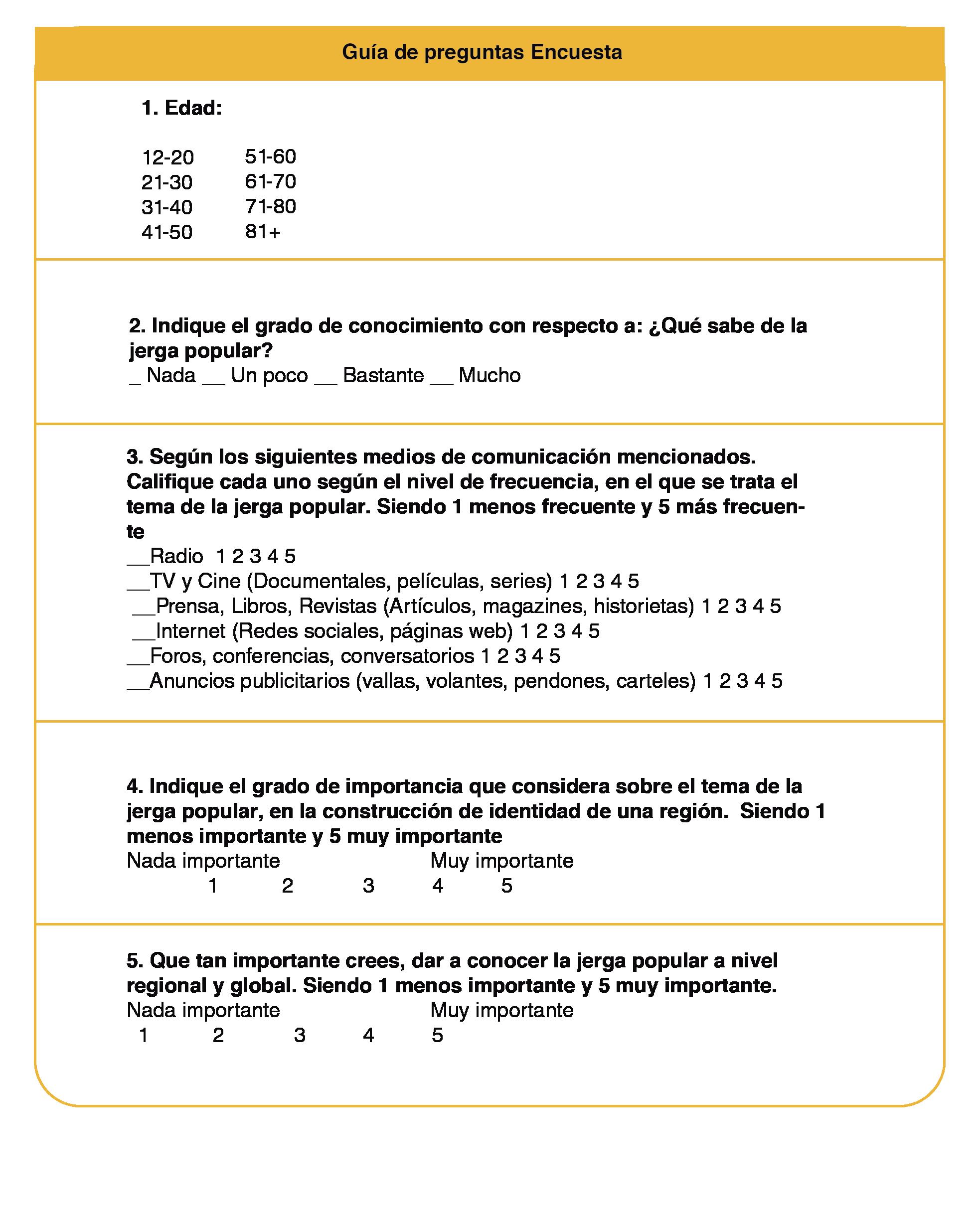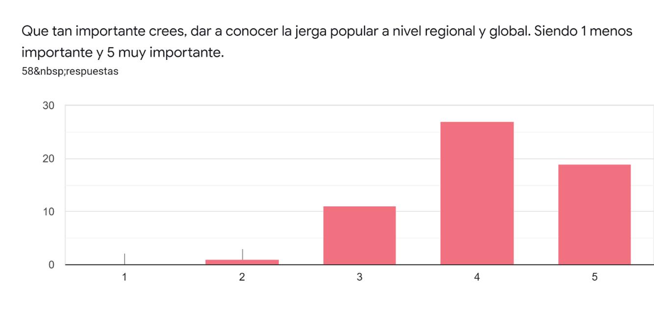 El 47% de los encuestados, eligen la opción 4 que indica que es importante dar a conocer la jerga popular a nivel regional y global. Sin embargo, para lo s encuestados no es primordial esto, ya que el 33% indica que es muy importante, evidenciando un porcentaje menor al anterior mencionado.