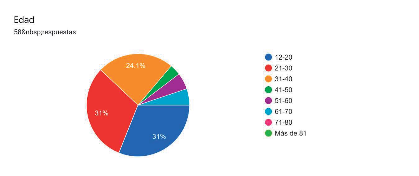 Comentario: La edades en las cuales hubo mayor porcentaje fueron entre 12 20 y 21 30, se evidencia que fueron más personas jóvenes quienes respondieron la encuesta.