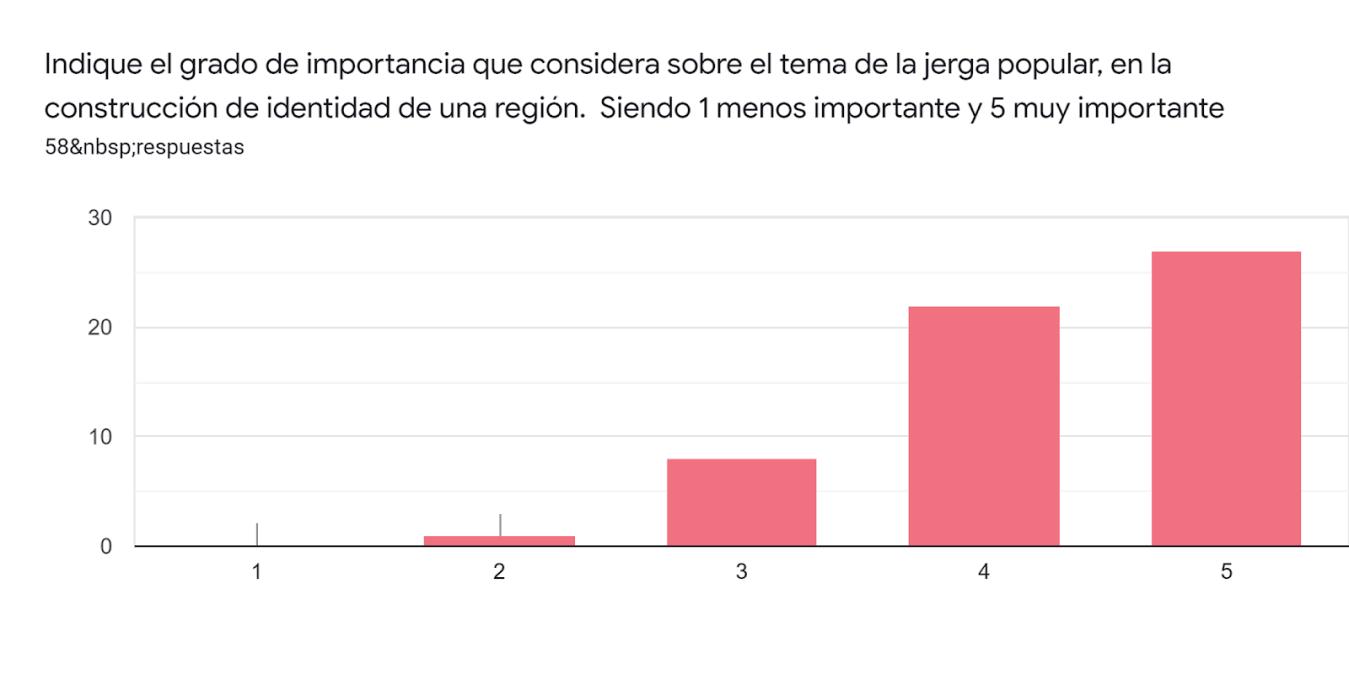 El 47% de los encuestados, eligen la opción 5, que indica que para los participantes de la encuesta es muy importante la jerga popular, como generadora de identidad en una región. Esto evidencia que es necesario, dar a conocer los valores y la importancia que tiene, en los medios de comunicación, para lograr que la información llegue a todas las personas.