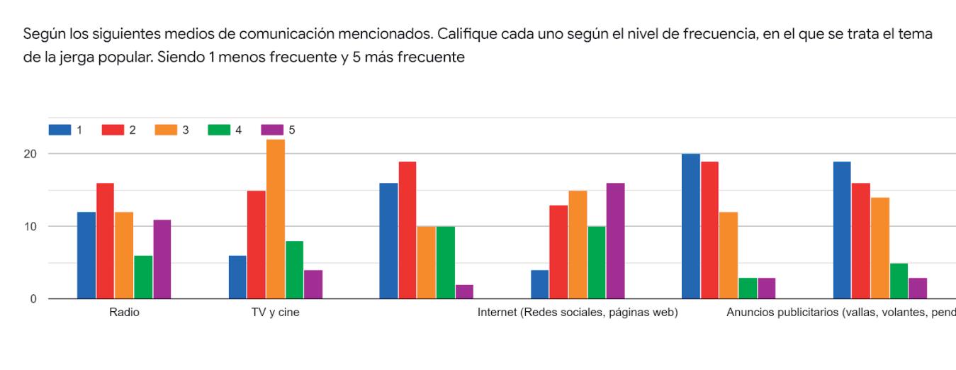 Comentario: En la opción de radio, la mayoría de los encuestados (28%) eligen la opción 2, que evidencia que en este medio, es poco frecuente escuchar sobre el tema de la jerga.
