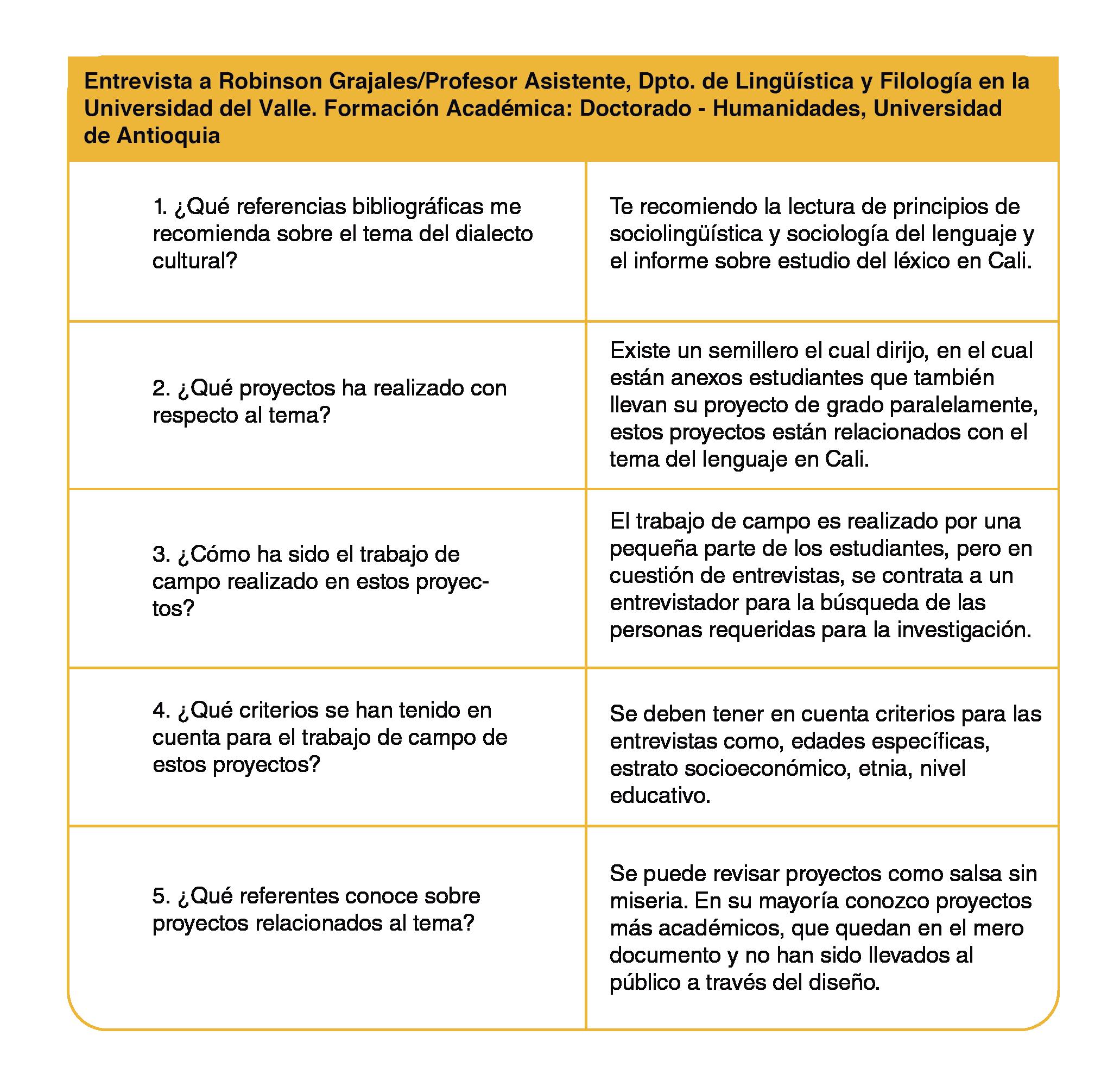 Agradezco enormemente al profesor Robinson Grajales, quien creyó en el proyecto desde el momento que se lo comenté y decidió aliarse para que yo pudiera contar con un apoyo en los temas de lingüística.