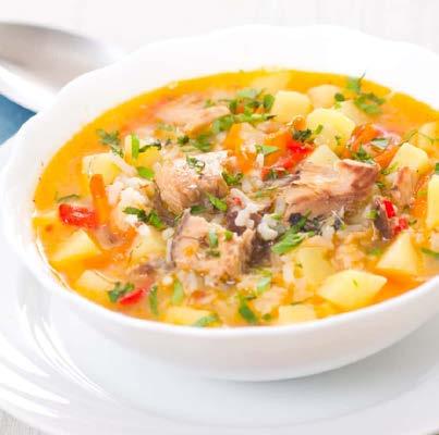 Espolvorear el pescado con la harina y freírlo en aceite hasta que se dore ligeramente. Agregar cebolla, chile verde y arroz. Agregar agua, las verduras y el jugo de tomate. Cocinar a fuego lento durante 30 minutos. Agregar la yerbabuena y el orégano, cocinar unos minutos más y servirlo con unas gotas de limón.