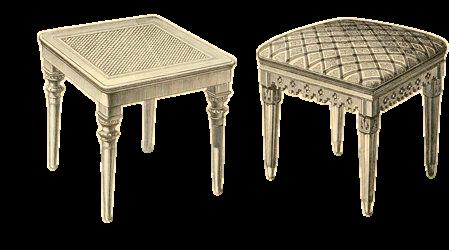 Las patas de los muebles están hechas de madera torneada. Se construían muebles de carácter público con piedra y mármol, decorados con motivos arquitectónicos y animales fantásticos.