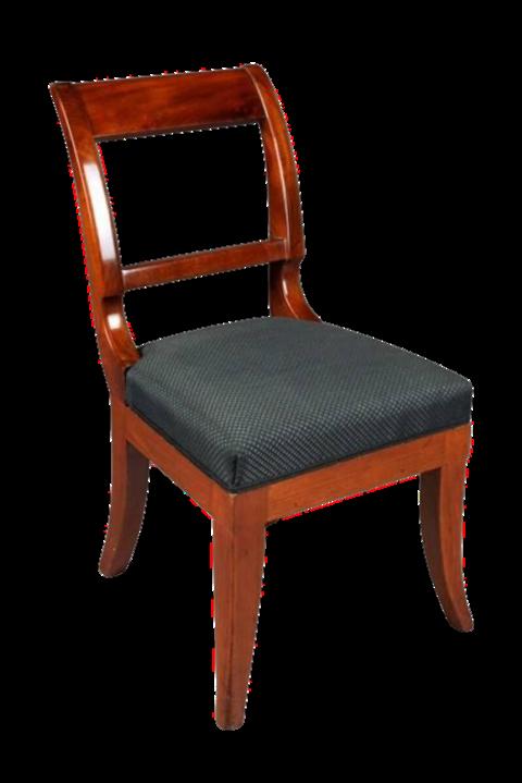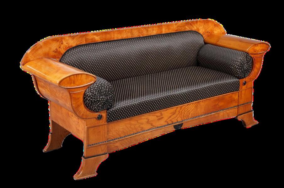 Se usan maderas nacionales : caoba, abedul claro, fresno, peral y cerezo.) sobriedad y simpleza de líneas, se obtiene un mueble sin ostentación ni pretensiones artísticas, con decoración escasa y una finalidad utilitaria. las patas y los respaldos son curvados, tanto en asientos como mesas. se utilizan tapizados de percal con dibujo de flores, relleno de crin (tejido hecho con pelo de caballo) y en los muebles de superior calidad los tejidos de lana y algodón estampados. se utilizan formas de cisnes de cuello curvado en los brazos de muebles de asiento; cuernos de la abundancia, cornucopias, flores y frutas caseras; grifos y follaje,