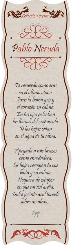 Marcadores de libros con los poemas de Pablo Neruda, impresos en papel reciclado y con imán en el dorso para agarrar las páginas o utilizarse de adorno.