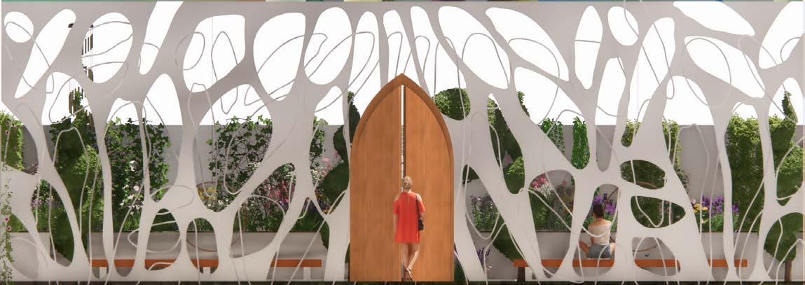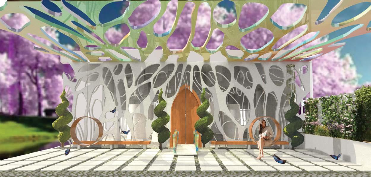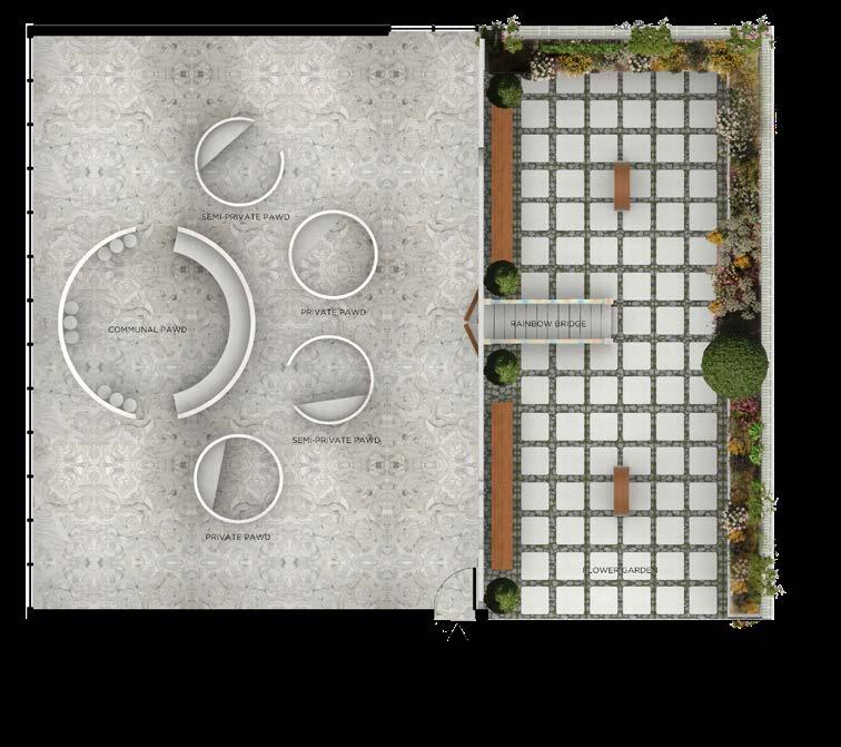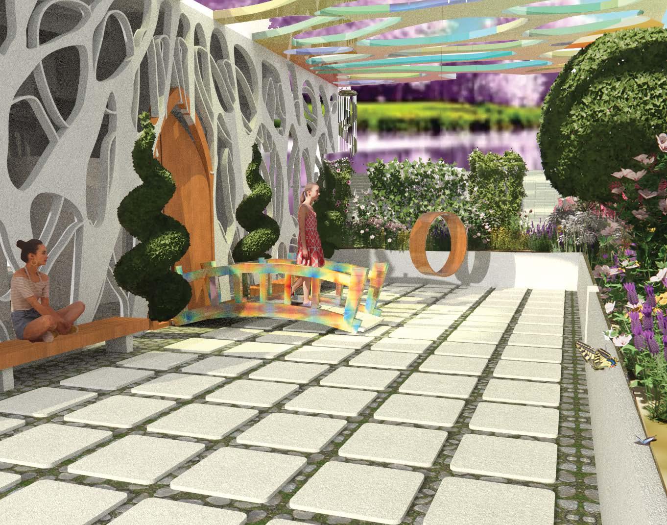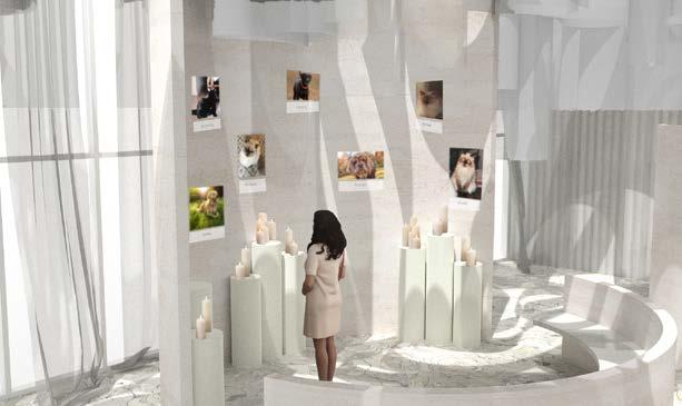 The intent of this memorial is to commemorate the passing of pets and serves as a bridge between grief and moving forward. When a beloved pet passes, grief can be all consuming and leave you feeling lost and empty. This space is meant to represent that void while also bringing a sense of peace and tranquility. Entering through the courtyard is a physical metaphor for crossing the bridge from loss and total grief to starting to move forward. The exterior space is meant to evoke a purifying and enhancing energy leaving one renewed and uplifted.