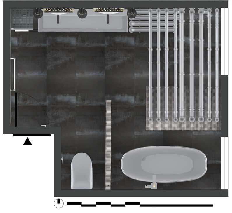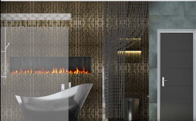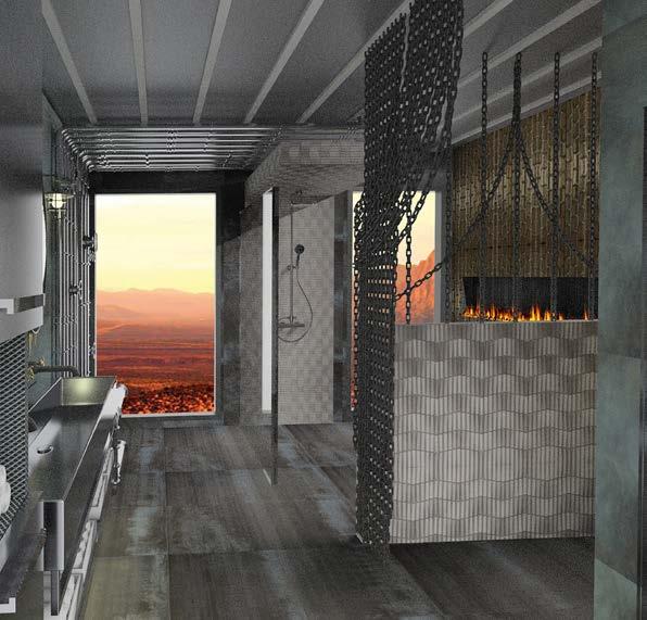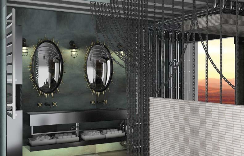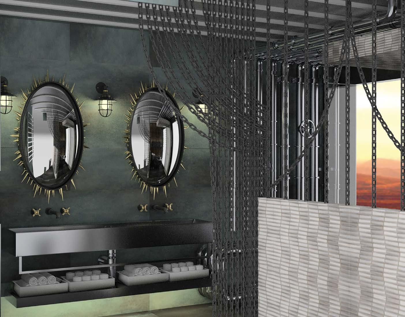 The cinematography in the movie Mad Max: Fury Road provides inspiration for a modern industrial bathroom. The fleet of cars in the film translates to an all metal interior using materials such as steel, chrome, and brass. Exposed plumbing fixtures lends to the industrial style. As in the movie, the element of fire is incorporated to add contrast and variety.