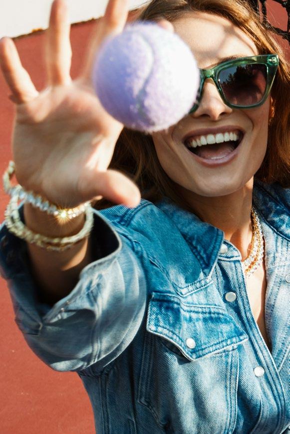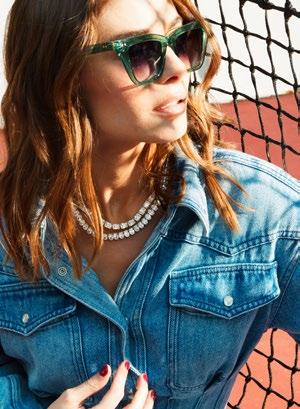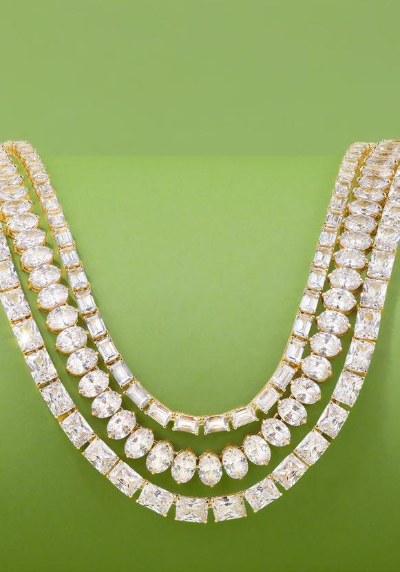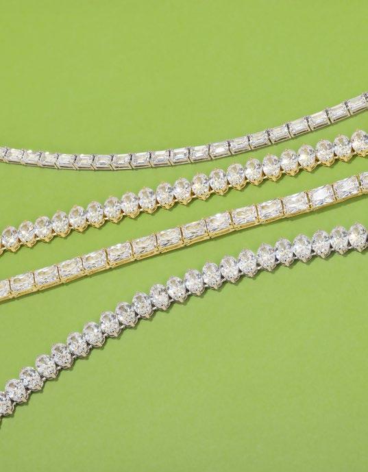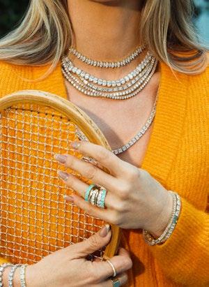 Left Page: Baby Grand Slam Tennis Necklace 16” $185, Hello Gorgeous Tennis Necklace 16” $195, Grand Slam Tennis Necklace 16” $195 Right Page: Hello Gorgeous Drop Earrings $68, Grand Slam Tennis Necklace 16” $195, Grand Slam Tennis Bracelet $105, Baby Grand Slam Tennis Bracelet $98, Hello Gorgeous Tennis Bracelet $105