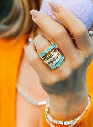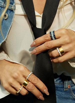 Grand Heiress Tennis Necklace 16” $175, Grand Heiress Sapphire Tennis Necklace $188, Grand Heiress Sapphire Ring $58, Grand Heiress Ring $58, Atlas Thick Band Ring $48