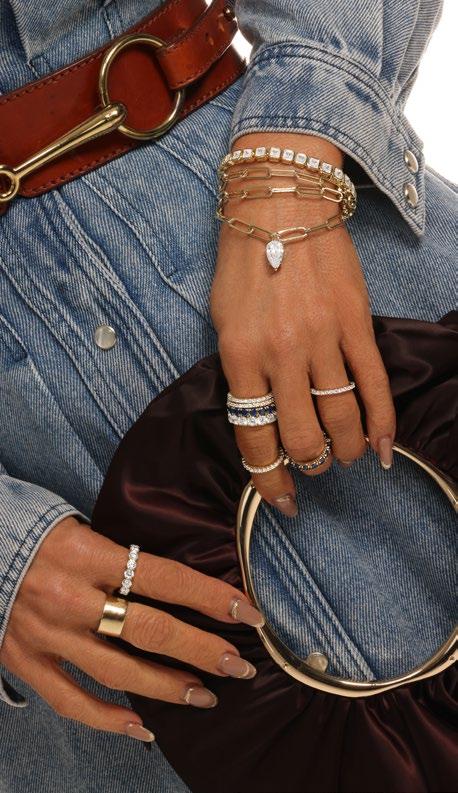 Right Page: Duchess Tennis Bracelet $95, Samantha Teardrop Necklace (worn as bracelet) $108,The Baby Heiress Ring $38, Grand Heiress Sapphire Ring $58, Grand Heiress Ring $58, Atlas Thick Band Ring $48
