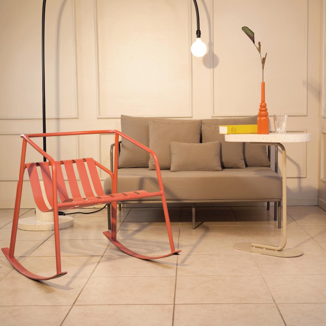 Its shape and size makes it easy to fit, while keeping the comfortability and functionality factors. Its lacquered metal structure and highly resistant and water-repellent fabrics, make it functional for both indoors and outdoors.