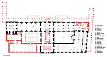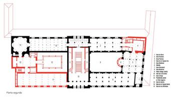 Según se muestra en los planos, las áreas resaltadas en rojo representan las partes de nueva construcción, lo cual indica que el edificio estaba muy deteriorado al inicio del proyecto. Para restaurar la forma original del edificio, se utilizaron dos materiales: hormigón blanco con incrustaciones de mármol de Sajonia y ladrillo visto hecho a mano. En otro plano secundario, se observa el uso de vidrio y maderas oscuras para construir elementos secundarios como bancos, barandillas y expositores, los cuales se diseñaron de manera discreta para pasar desapercibidos, ya que no fue posible interpretar fielmente los elementos originales, por lo que se crearon completamente nuevos, como la estructura de la cubierta del vestíbulo. Se aplicó el artículo 12 de las Cartas de Venecia, que menciona integrar armoniosamente los elementos reemplazantes, distinguiéndose de los originales a fin de no falsificarlos. La restauración llenó los espacios vacíos siguiendo la secuencia original, generando una continuidad que se evidencia en los diferentes niveles del edificio. Sin embargo, a pesar de buscar la continuidad, no se compite con la estructura existente, sino que se complementa.