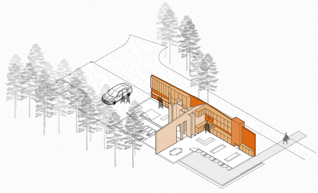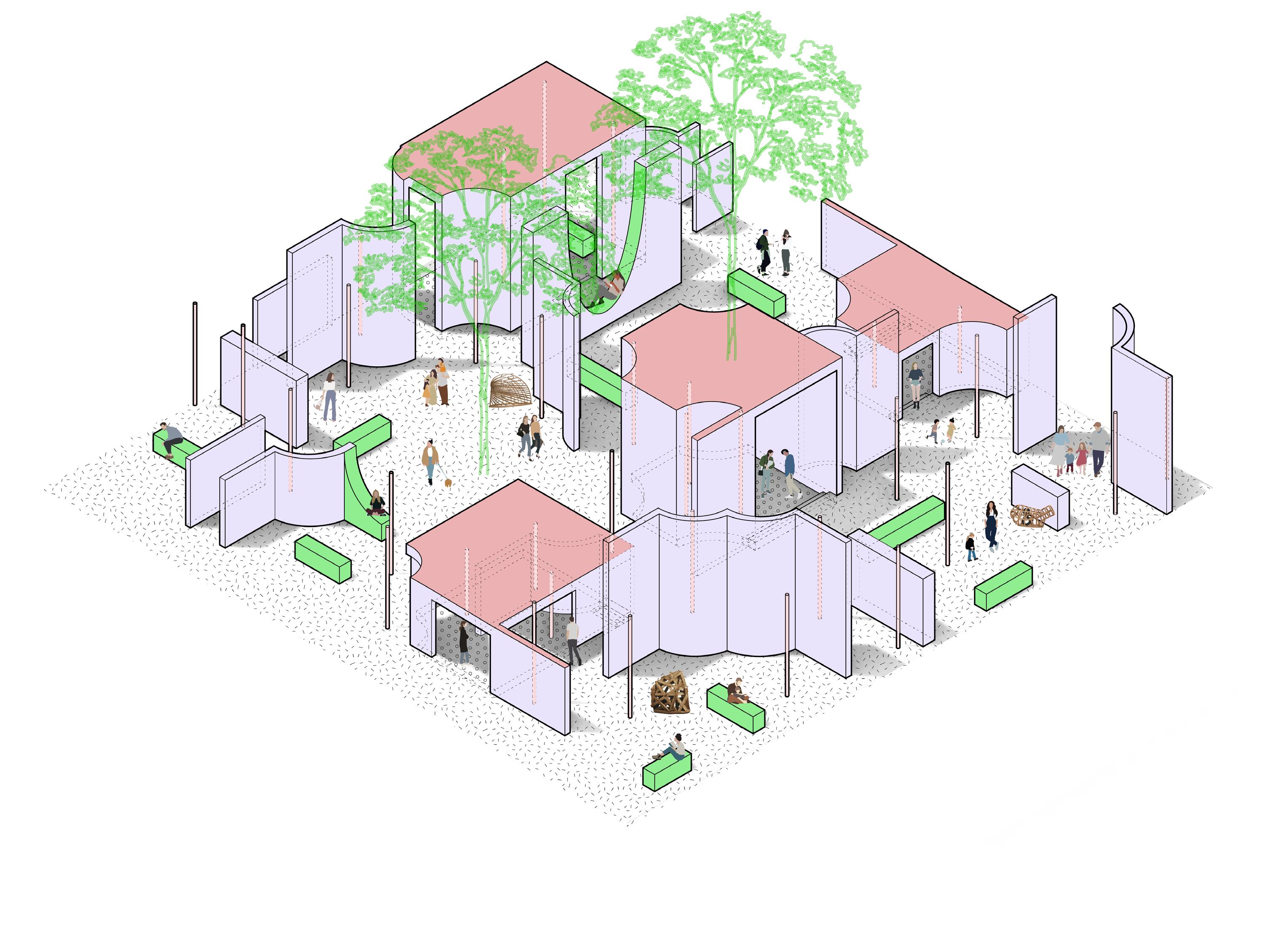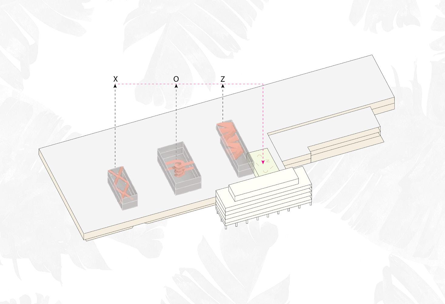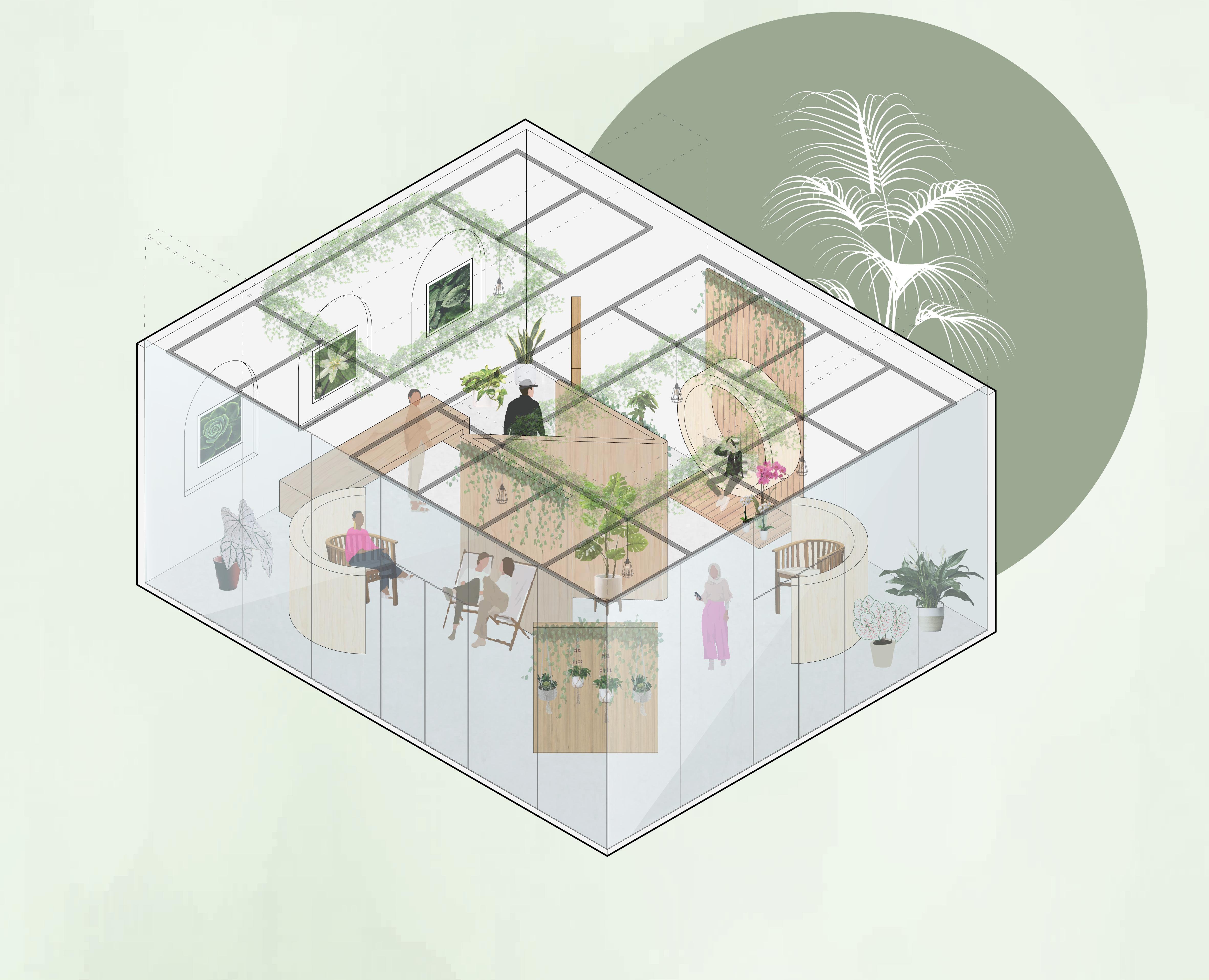 Isometric depicting the designed space with the X, Z, and O walls, vegetation, and a hanging metal structure to provide warm light.