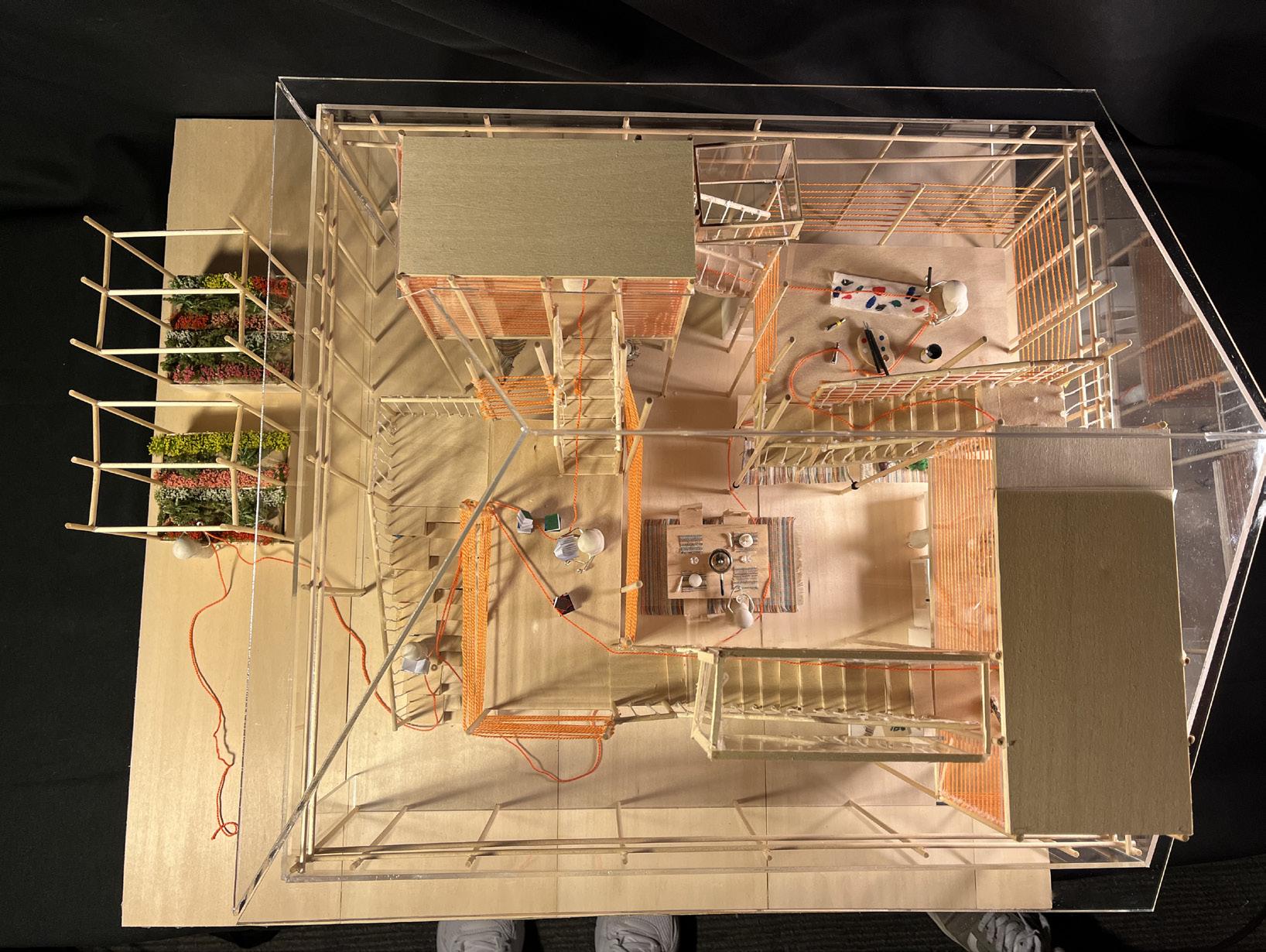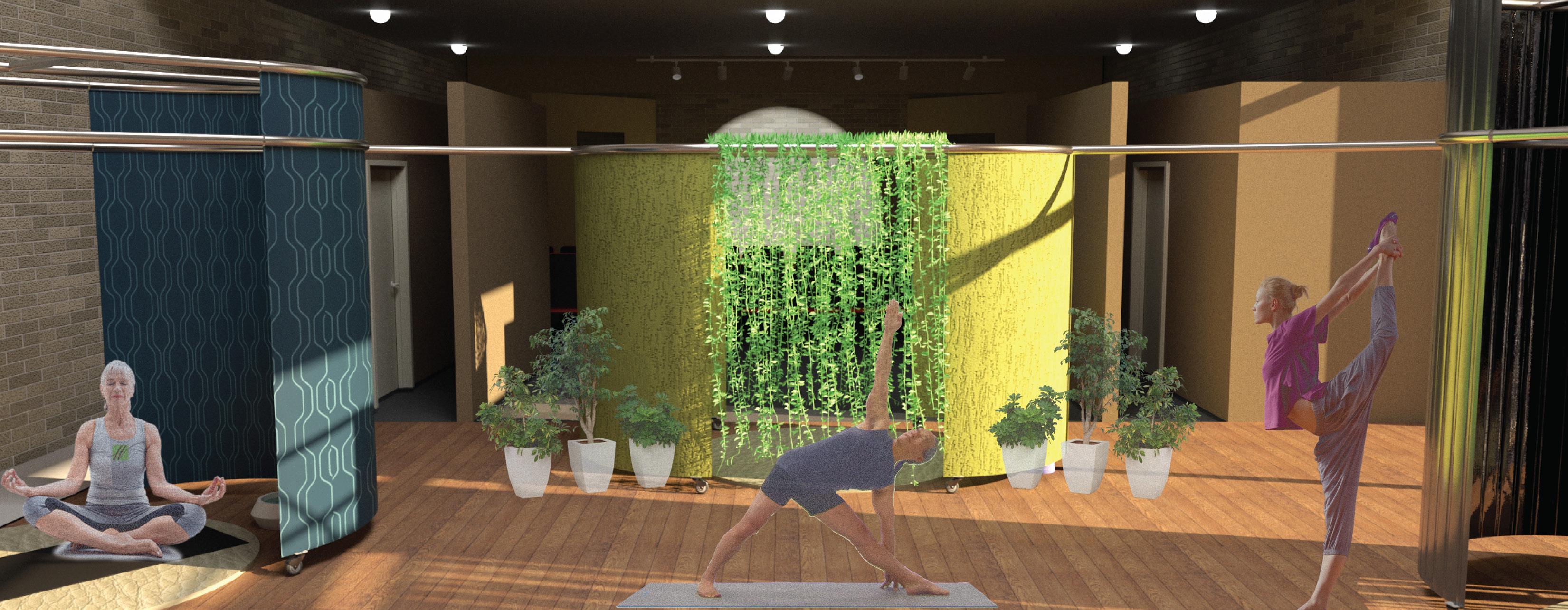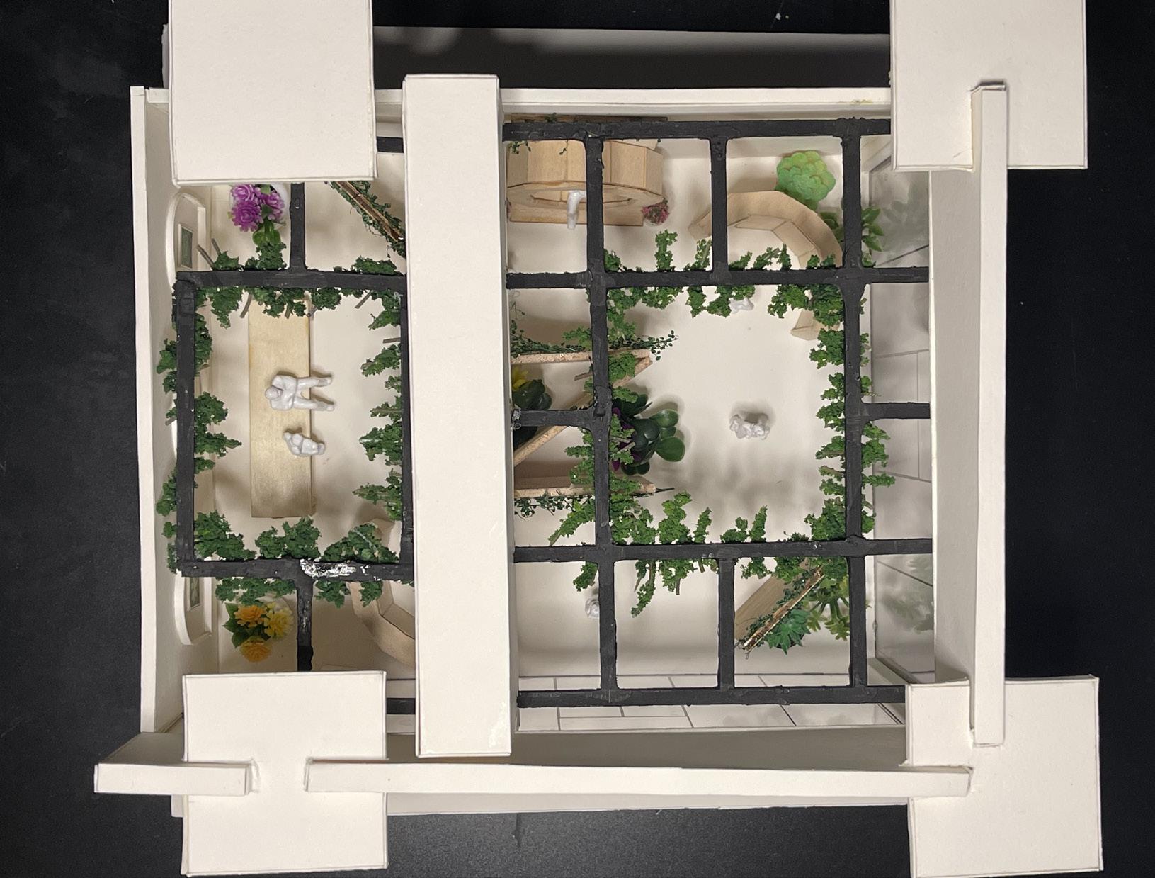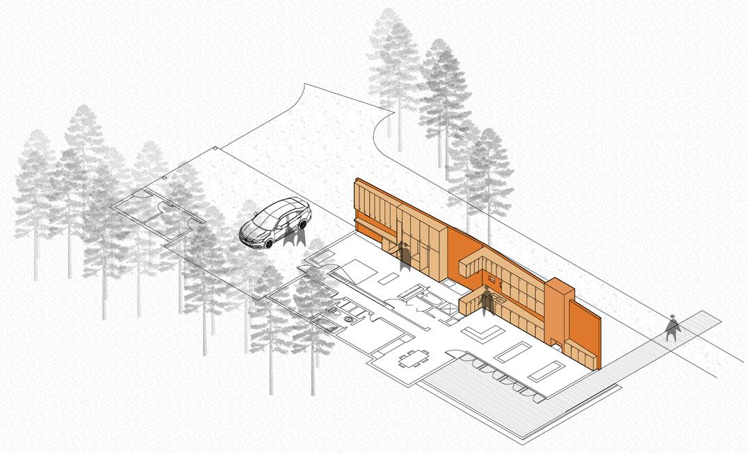 Isometric depicting the designed space with the X, Z, and O walls, vegetation, and a hanging metal structure to provide warm light.