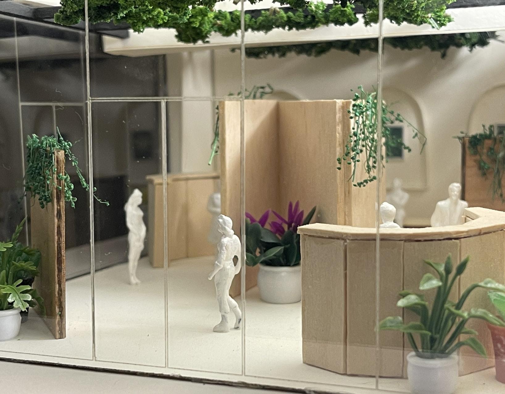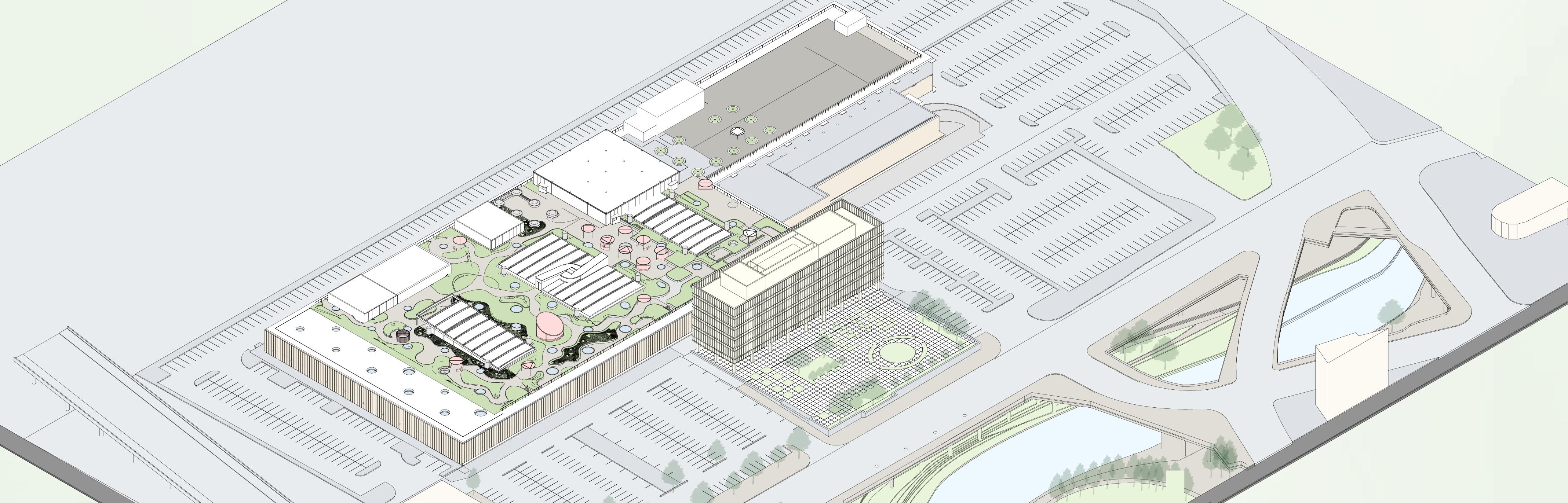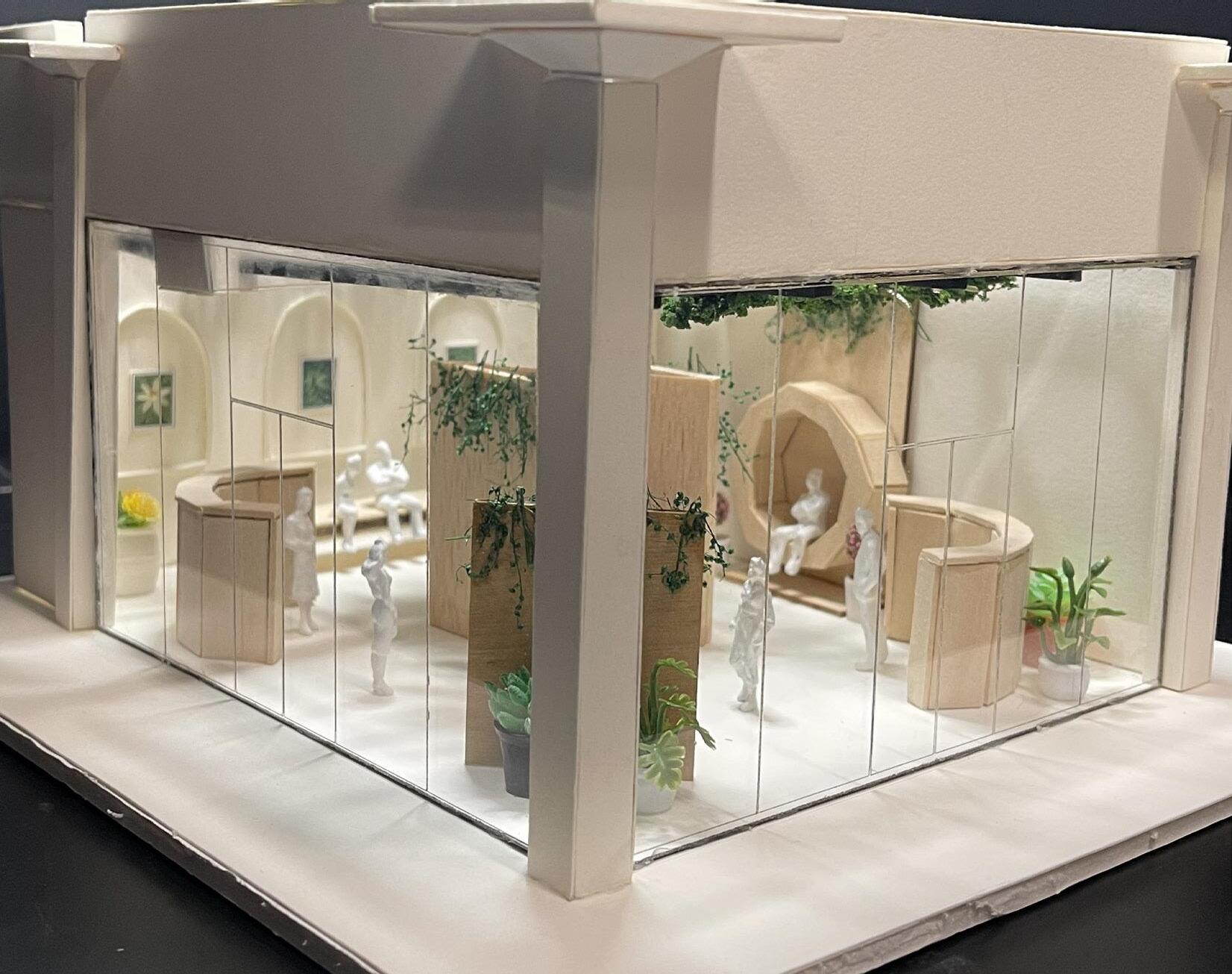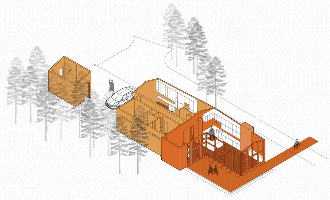 Isometric depicting the designed space with the X, Z, and O walls, vegetation, and a hanging metal structure to provide warm light.