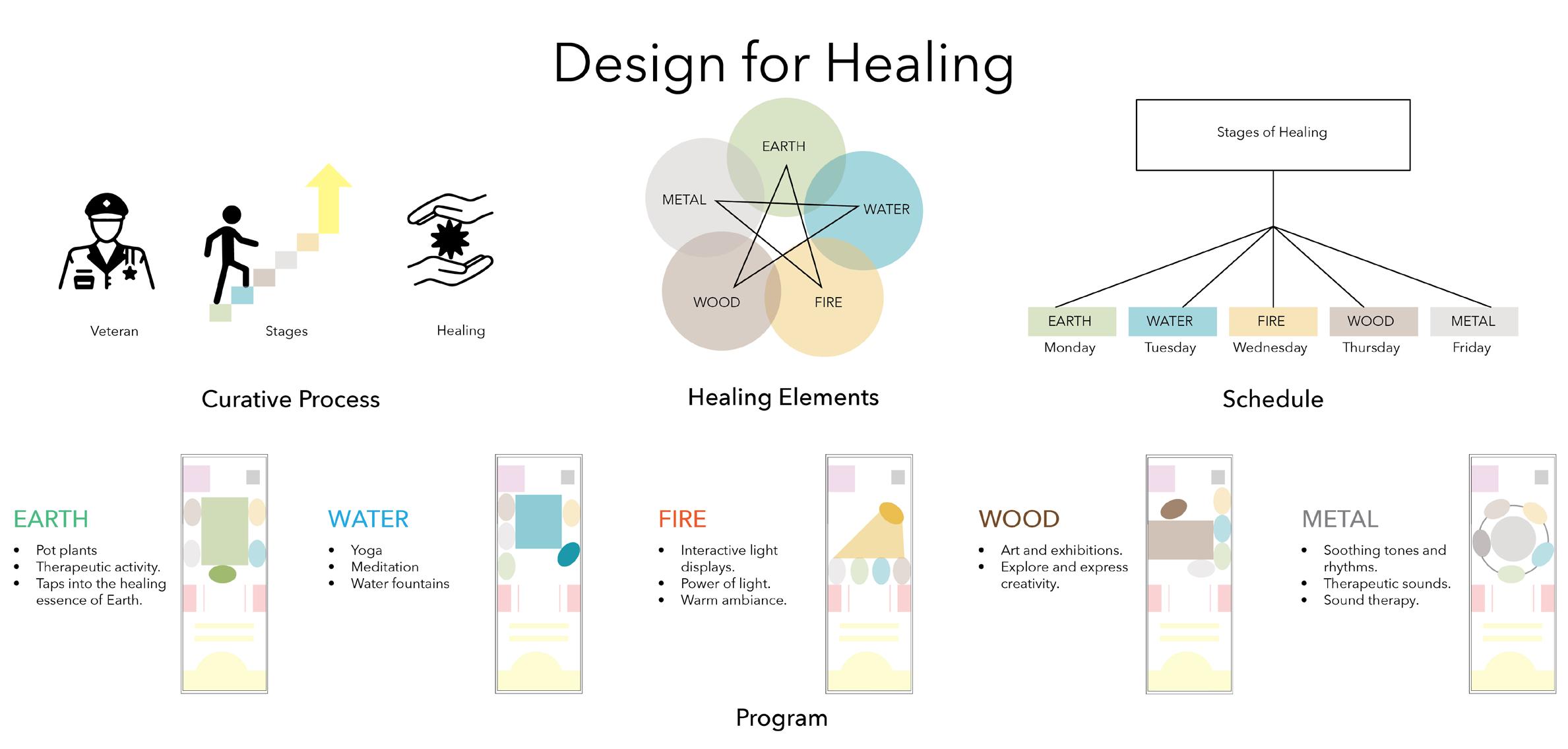 • Each of the five elements is featured in five healing pods with diverse activities allowing the veterans to focus on their overall well-being.