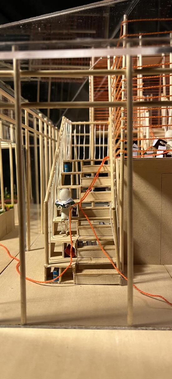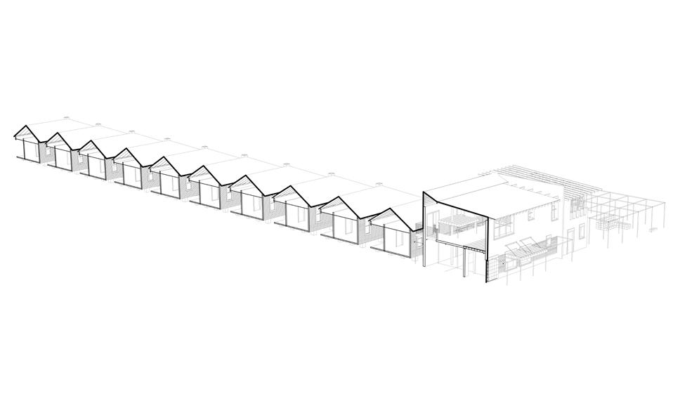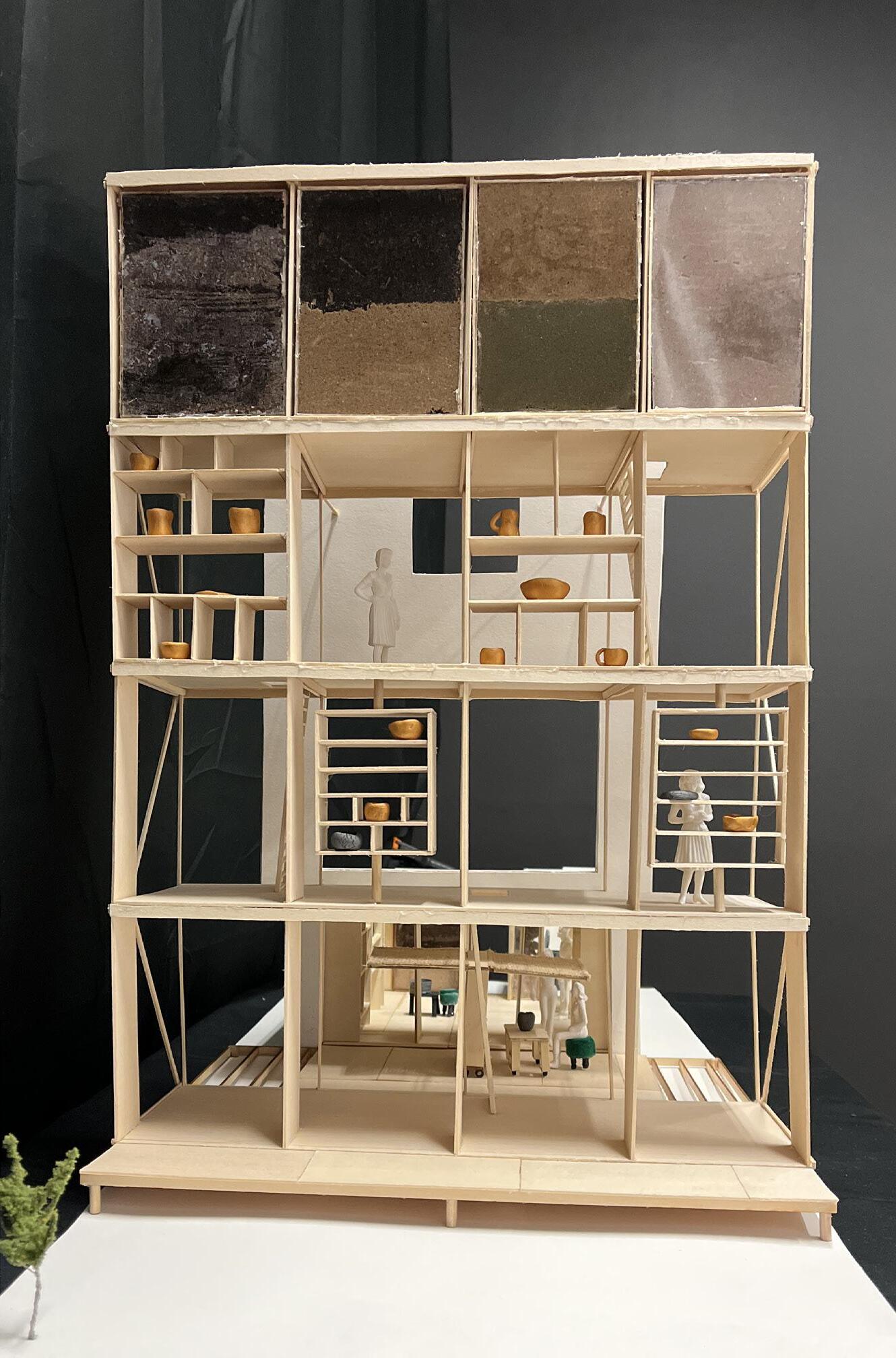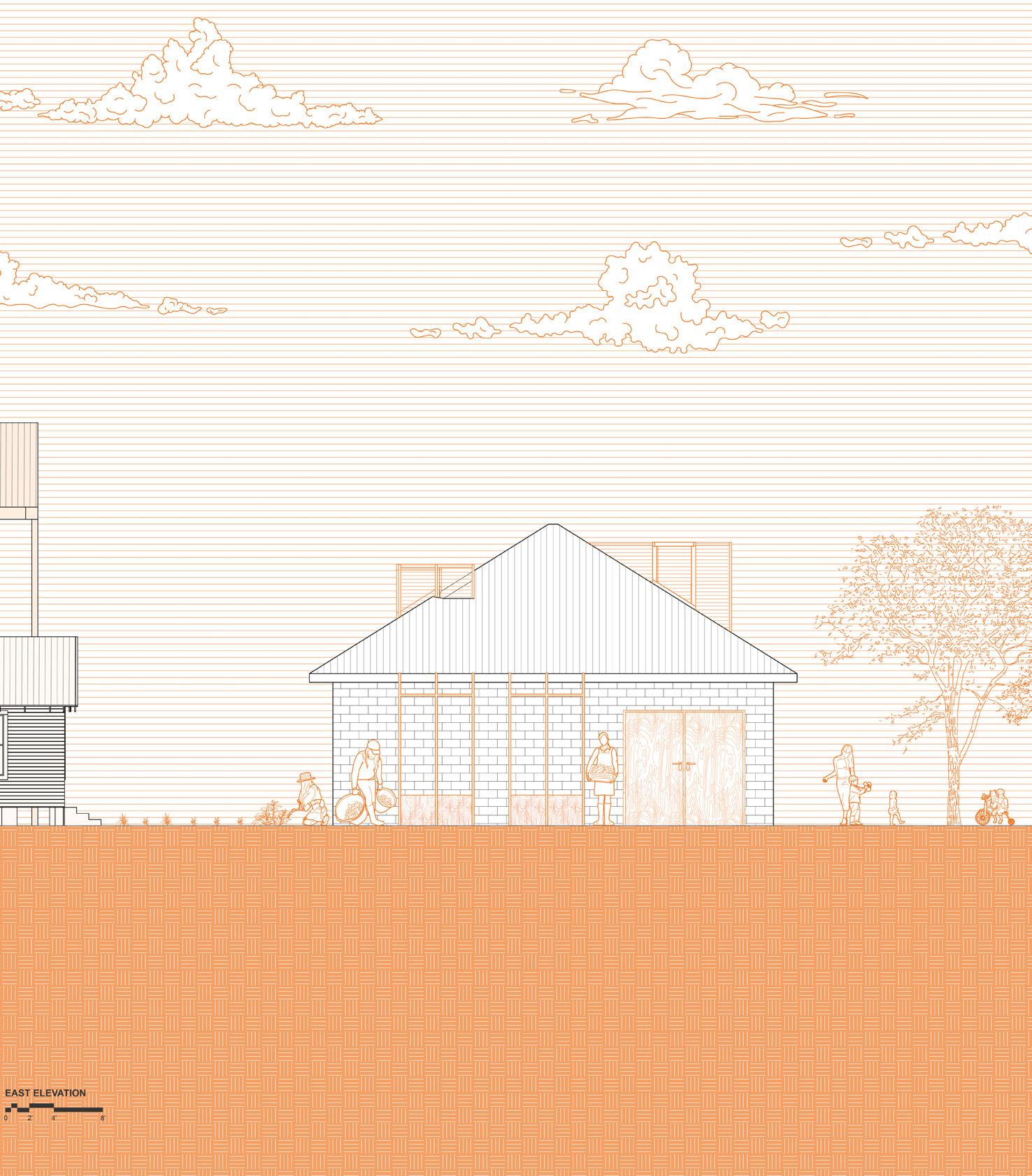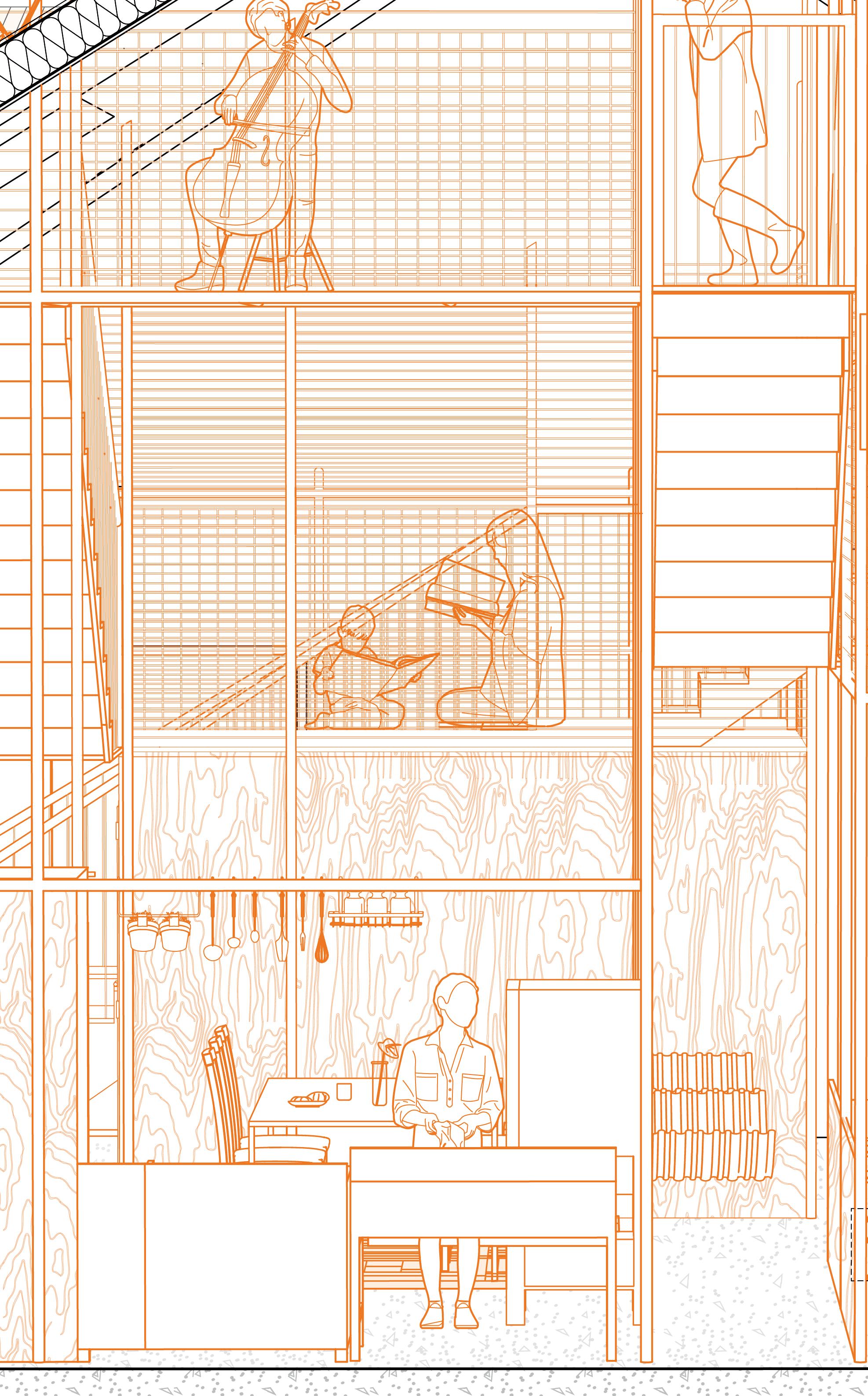 • Benefits for the mothers to utilize are the communal kitchen, dining space, and laundry space with folding boards and iron boards integrated within the scaffolding system.