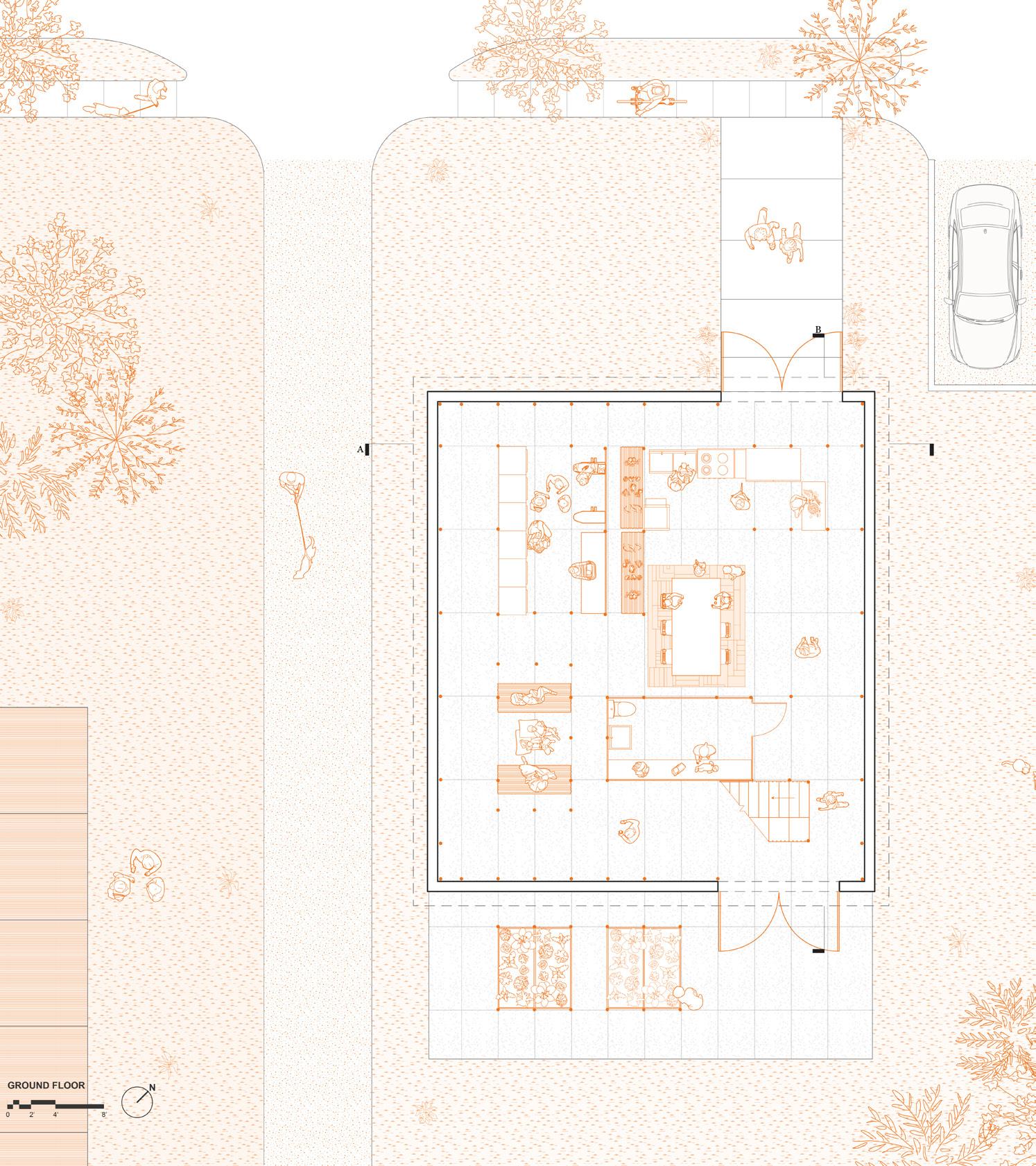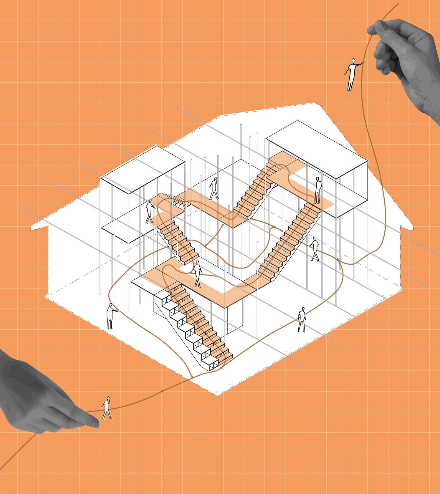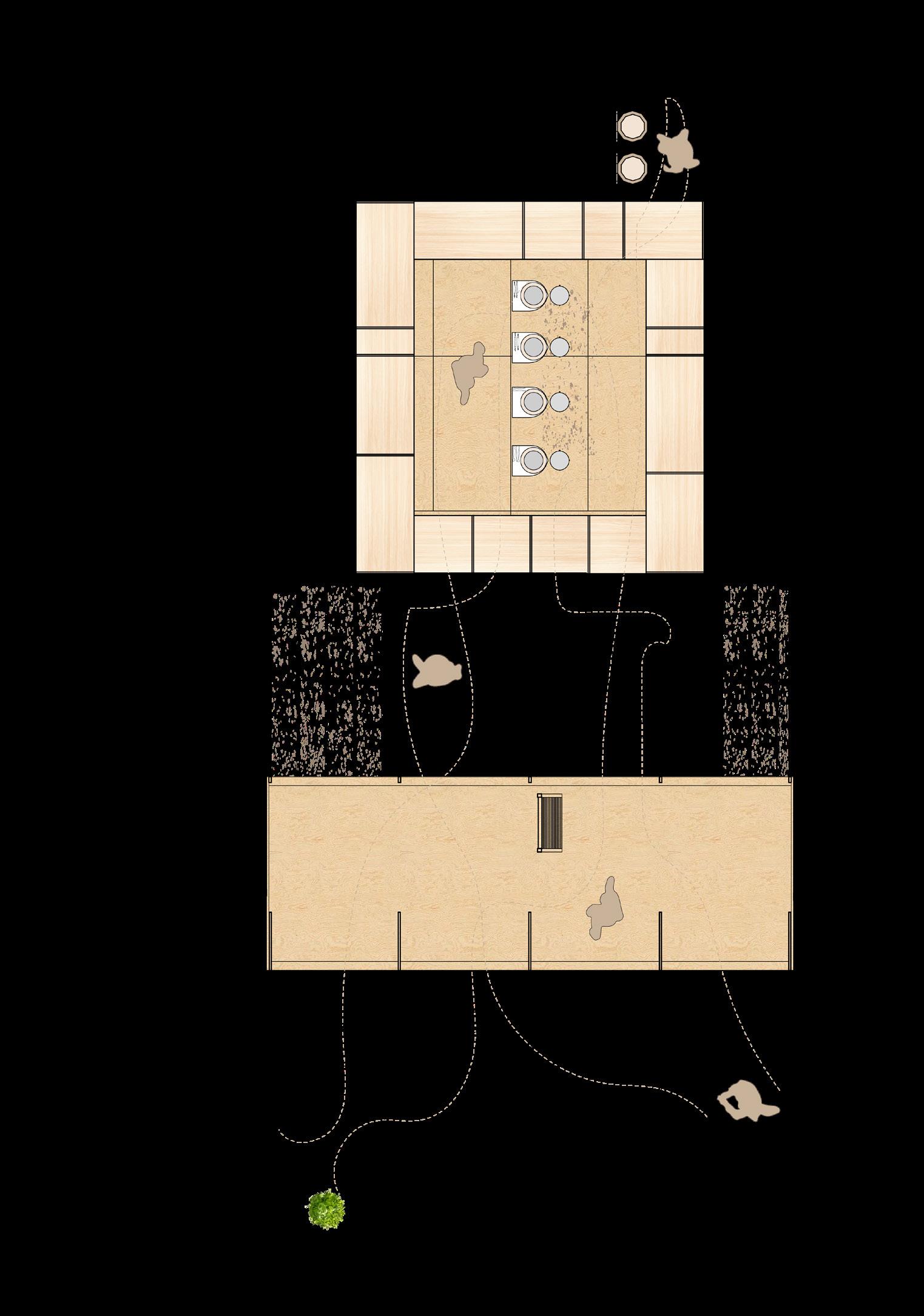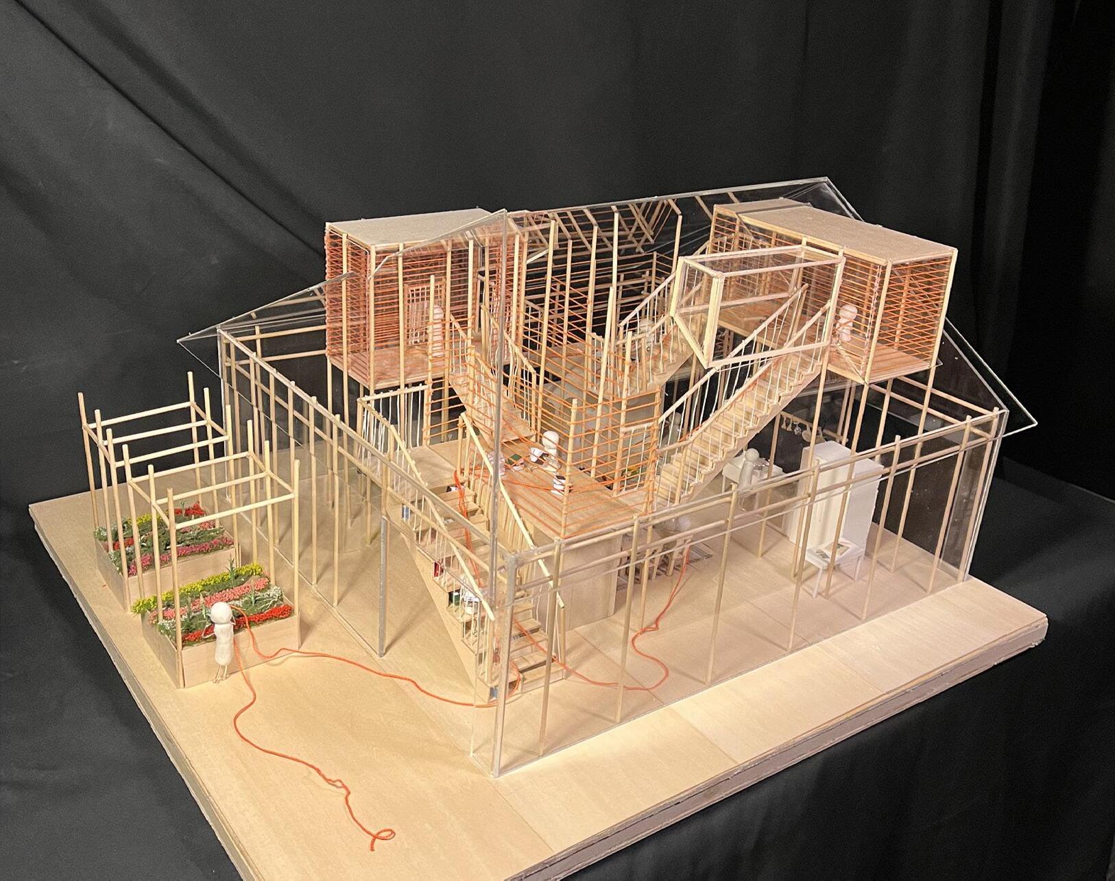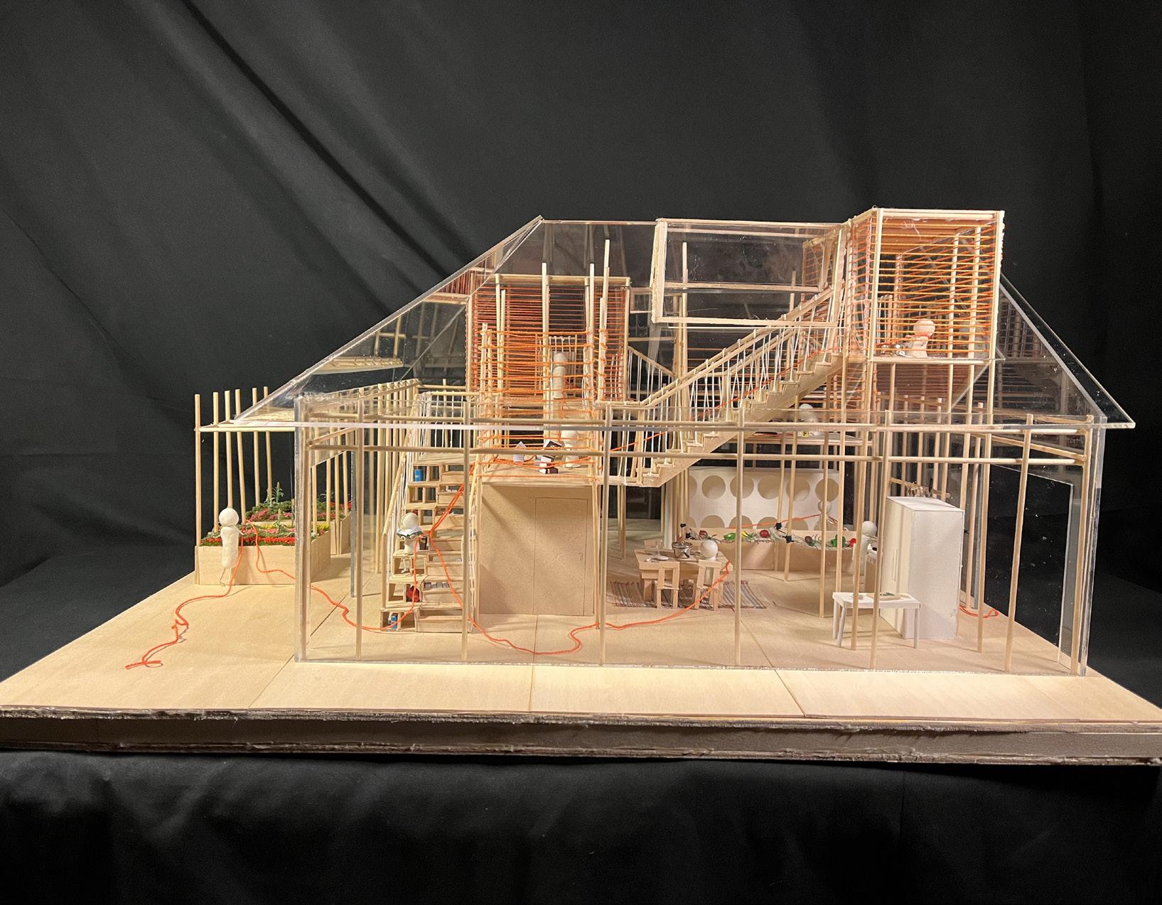 • Benefits for the mothers to utilize are the communal kitchen, dining space, and laundry space with folding boards and iron boards integrated within the scaffolding system.