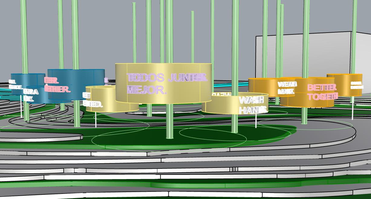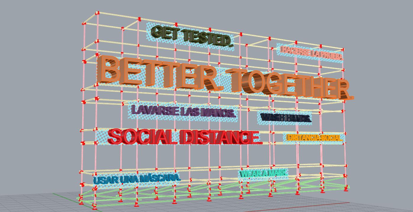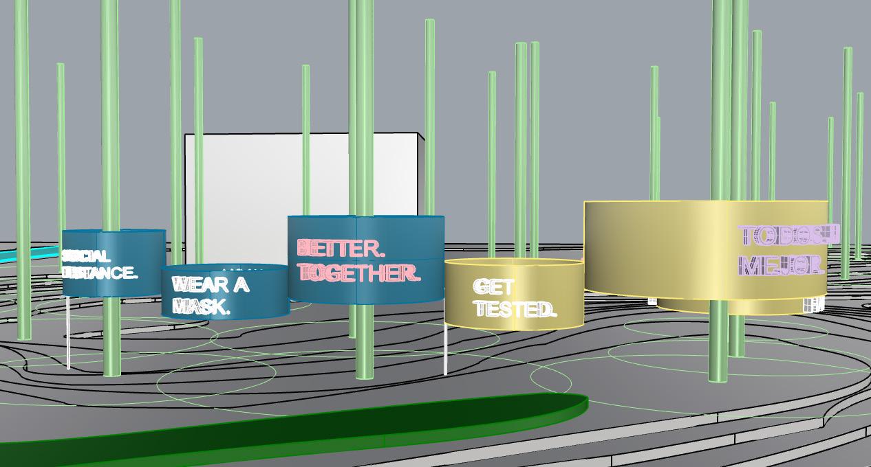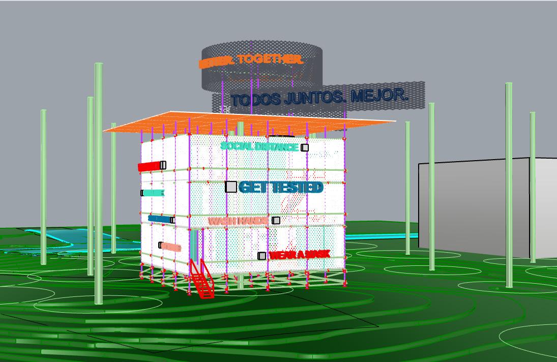 Designed in Rhino3D an outdoor 72ft x 72ft testing center for Covid19 that could later be repurposed for art or event space. Developed two outdoor Covid prevention signage in scaffolding and parks that helped English and Spanish speaking communities.
