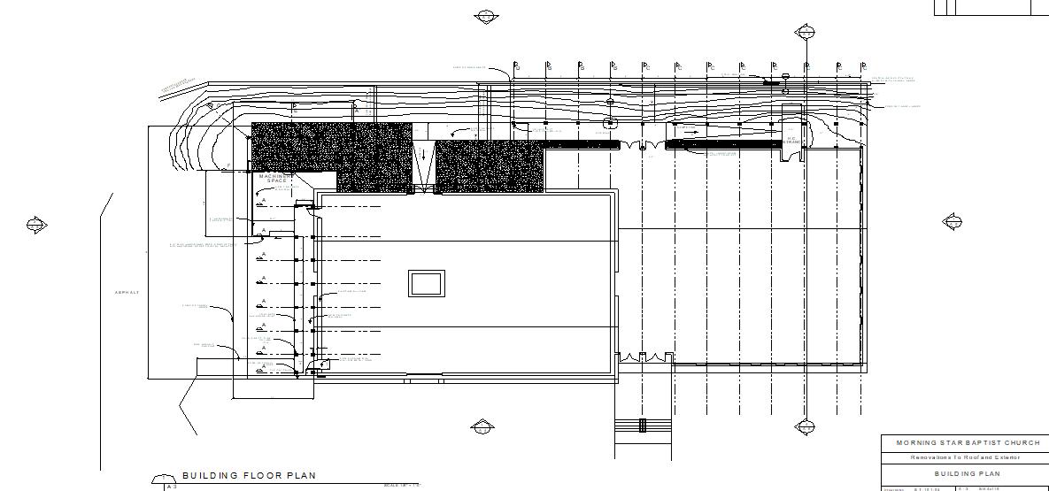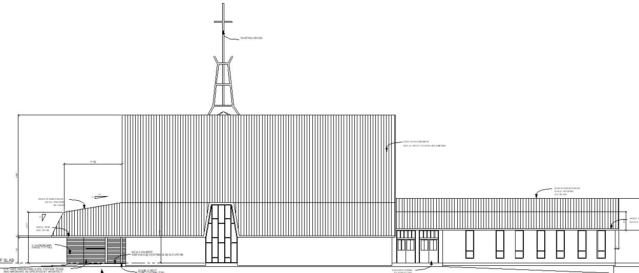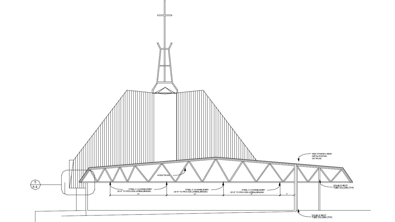 Create a 3D Rhino model of the church at a 1/8” scale using an elevation, floor plan, and images from the renovations to the roof and exterior.