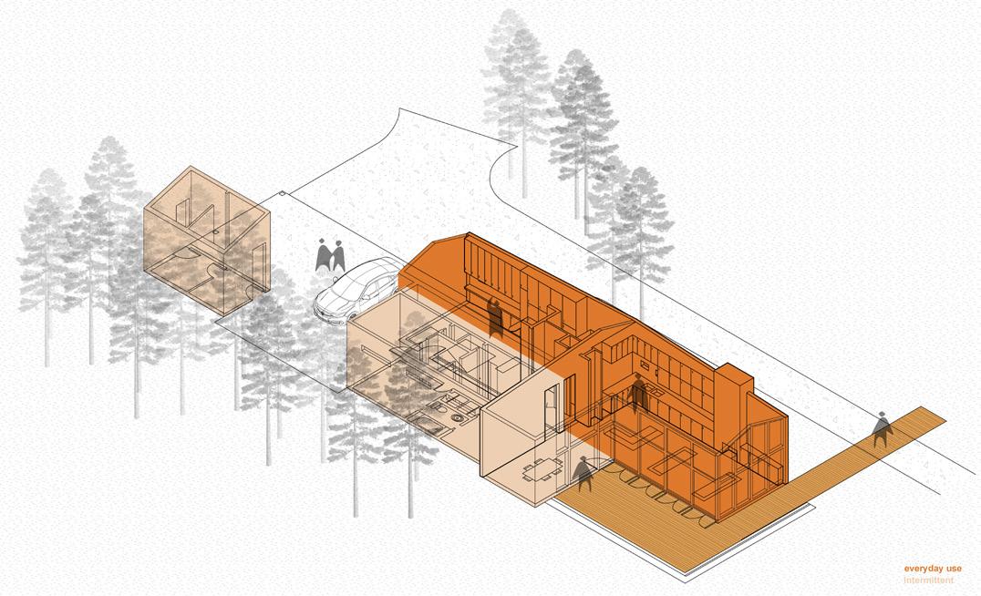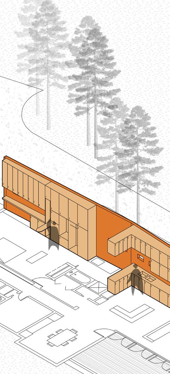 Updated an existing floor plan and then created a 3D model from it using measurements given from the architect and an elevation. Produced a series of diagrams to show programmatic activities, usage, the plumbing wall, and the north wall.
