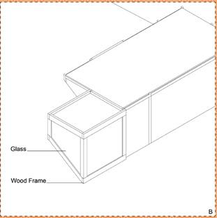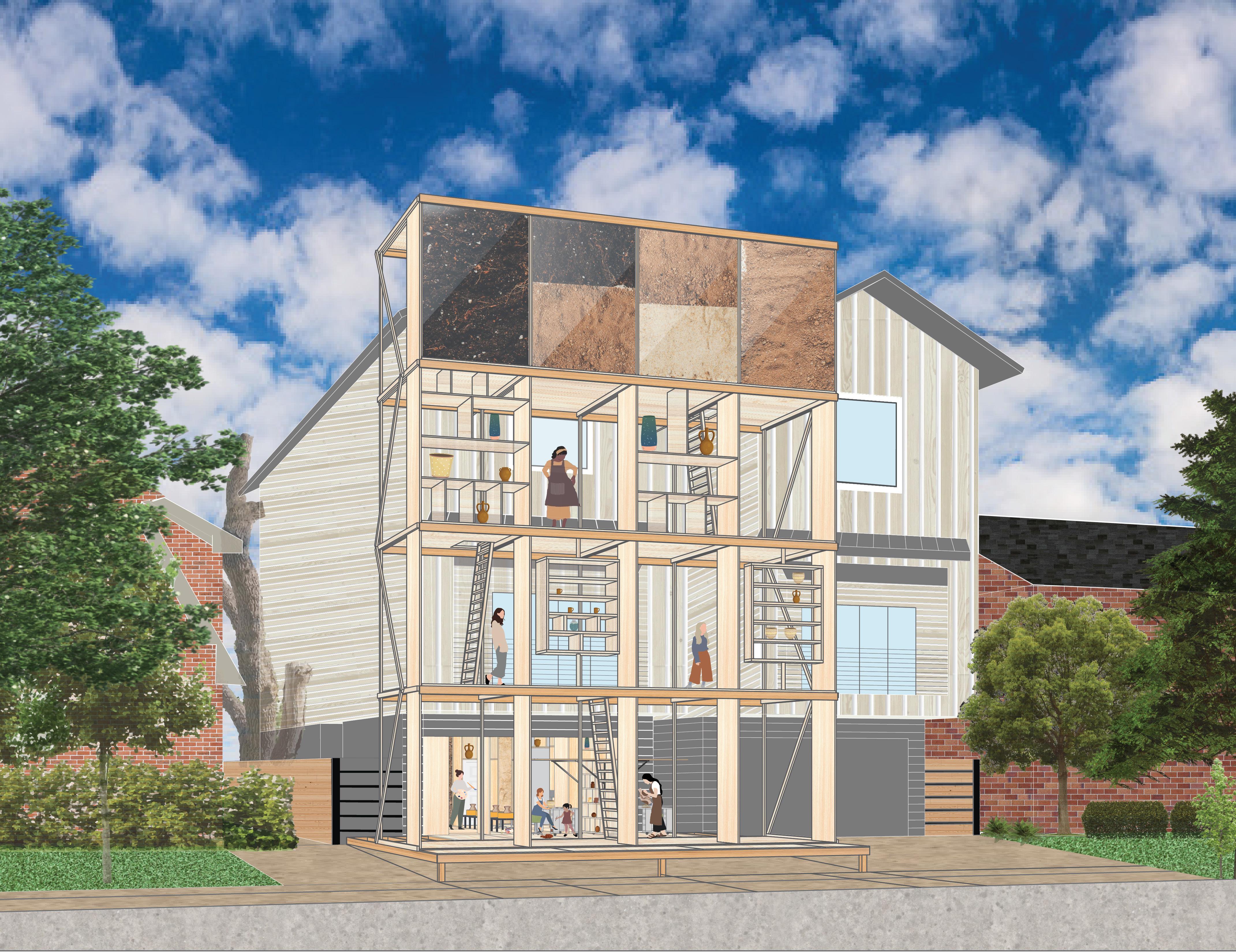 • Exterior facade made of plywood and standard framing 2x4’s for storing soil, air drying shelves, and displaying pottery creations.
