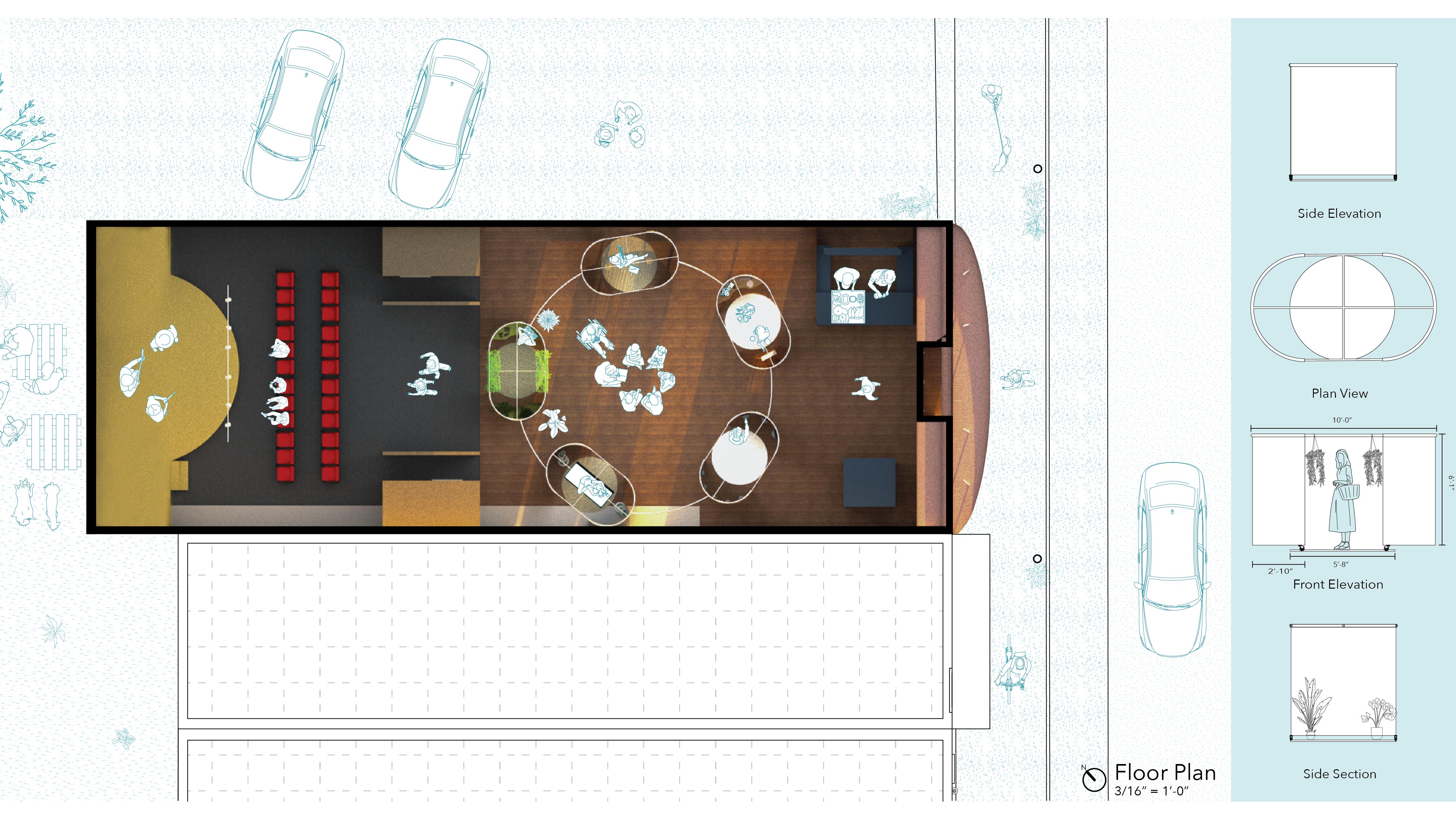 Updated 3D model to add contextual surroundings such as streets, sidewalks, light posts, and signs. Created various 2D drawings to represent new design interventions and concepts.