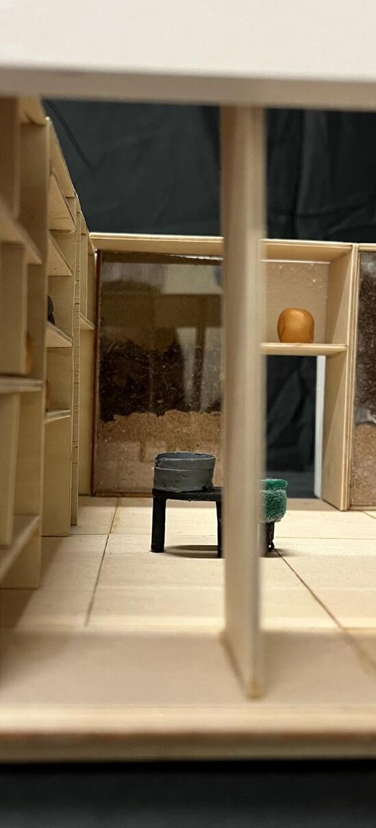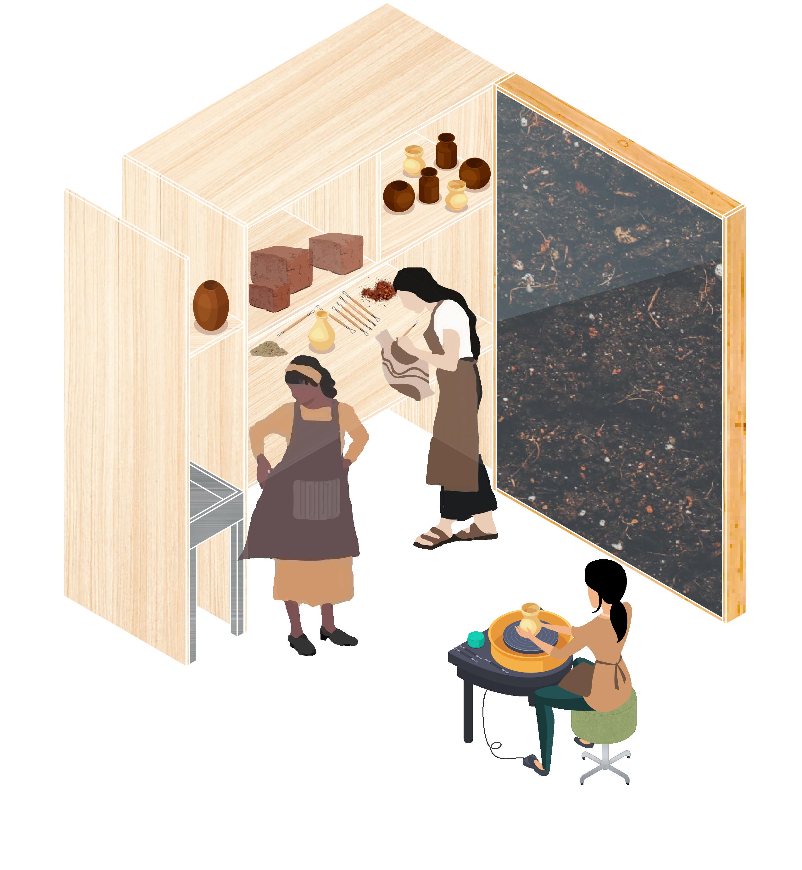 • Interior elements include kilns, sinks, pottery wheels, shelving for storage of tools and clay, and wood boxes to store more soil.