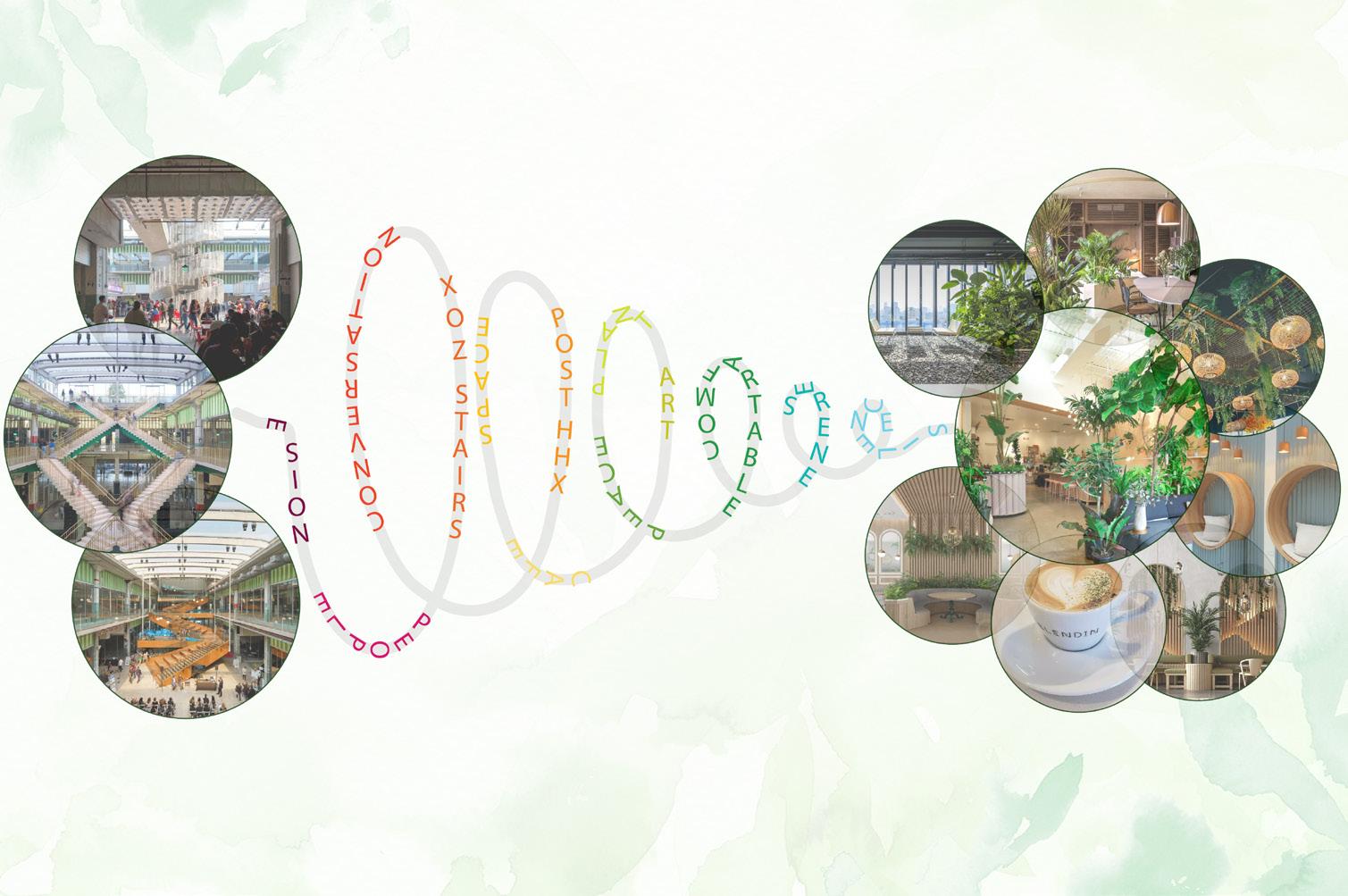• Influenced by the three amazing stairs to create walls that take the shapes from the X, O, and Z stairs located throughout the POST that create private spaces from which plants are hung.