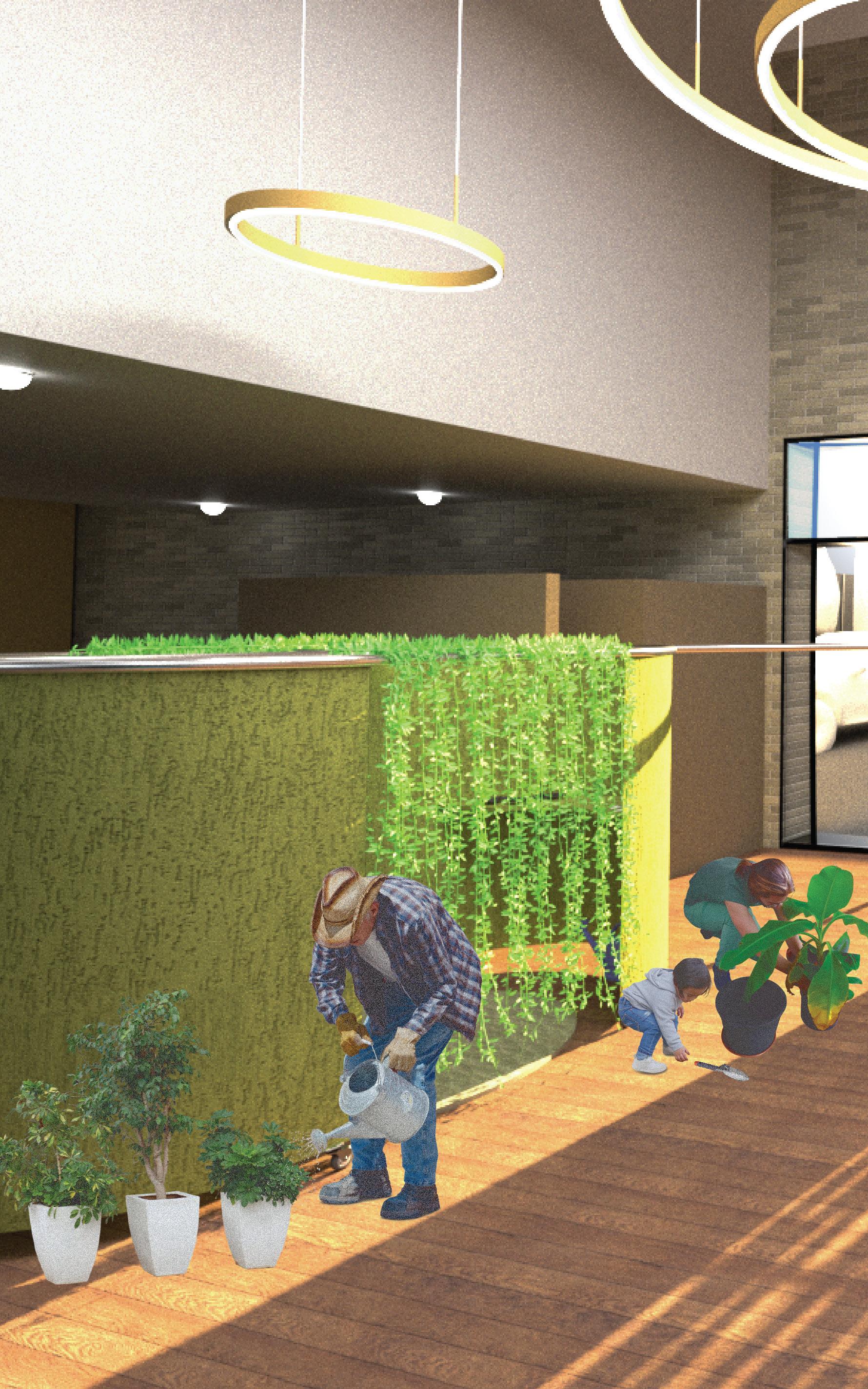 • Since the POST Sky lawn has nature and greenery we wanted to do the same by including them in the interior of the building.
