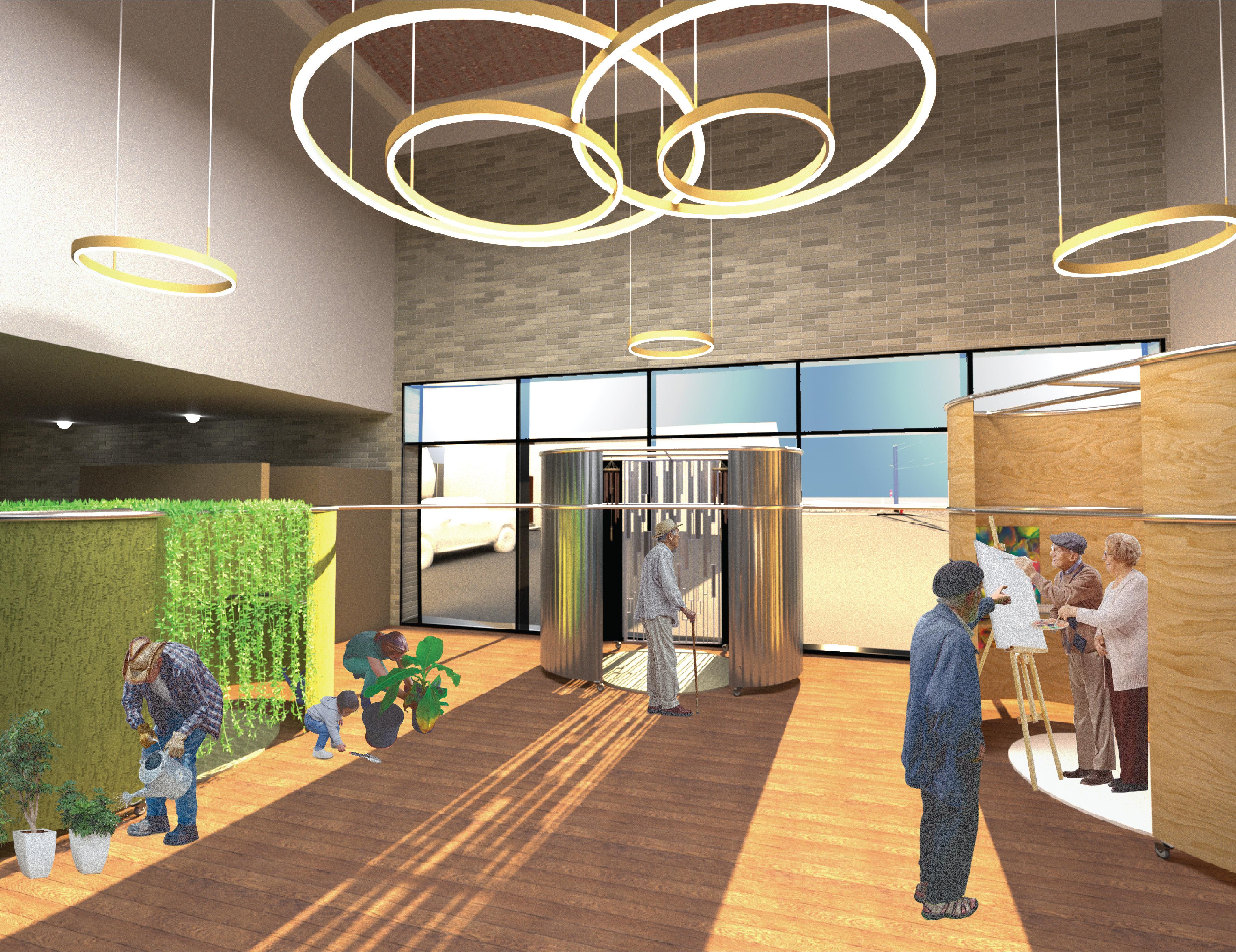 Interior Perspective of the veterans healing in the earth, metal, and wood pods. (Vray and Photoshop)