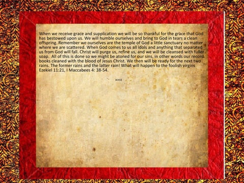 When we receive grace and supplication we will be so thankful for the grace that God has bestowed upon us. We will humble ourselves and bring to God in tears a clean offspring. Remember we ourselves are the temple of God a little sanctuary no matter where we are scattered. When God comes to us all idols and anything that separated us from God will fall. Christ will purge us, refine us, and we will be cleansed with fuller soap. All of this is done so we might be atoned for our sins, in other words our record books cleaned with the blood of Jesus Christ. We then will be ready for the next two rains. The former rains and the latter rain! What will happen to the foolish virgins Ezekiel 11:21, I Maccabees 4: 38-54. ď‚˜ď‚™