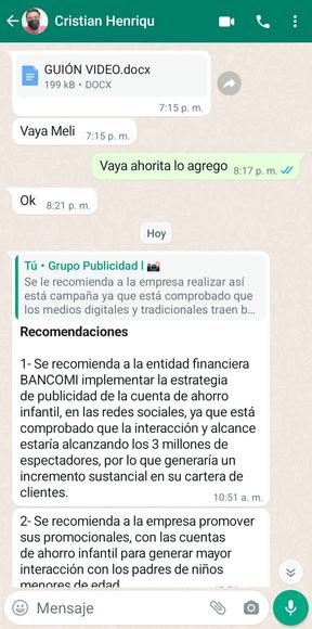 Se recomienda a la entidad financiera BANCOMI implementar la estrategia de publicidad de la cuenta de ahorro infantil, en las redes sociales, ya que está comprobado que la interacción y alcance estaría alcanzando los 3 millones de espectadores, por lo que generaría un incremento sustancial en su cartera de clientes.