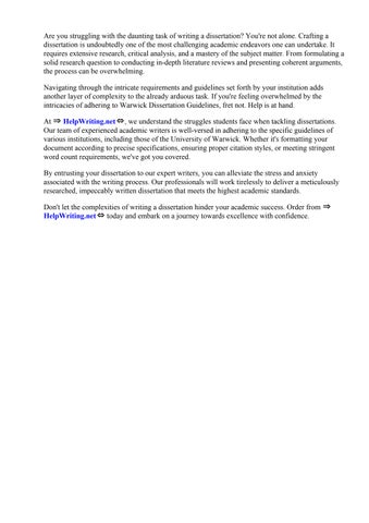 At ⇒ HelpWriting.net⇔, we understand the struggles students face when tackling dissertations. Our team of experienced academic writers is well-versed in adhering to the specific guidelines of various institutions, including those of the University of Warwick. Whether it's formatting your document according to precise specifications, ensuring proper citation styles, or meeting stringent word count requirements, we've got you covered.