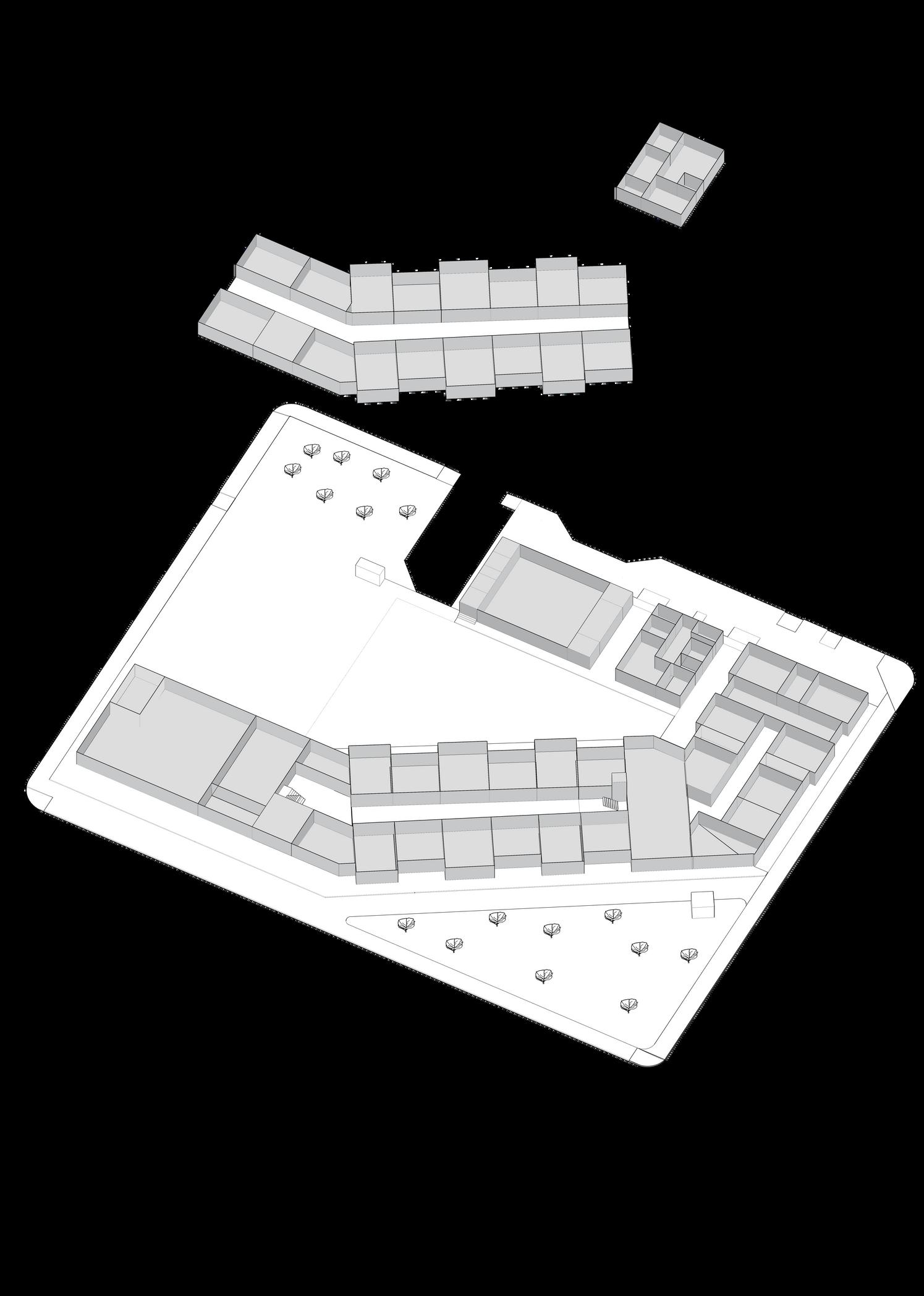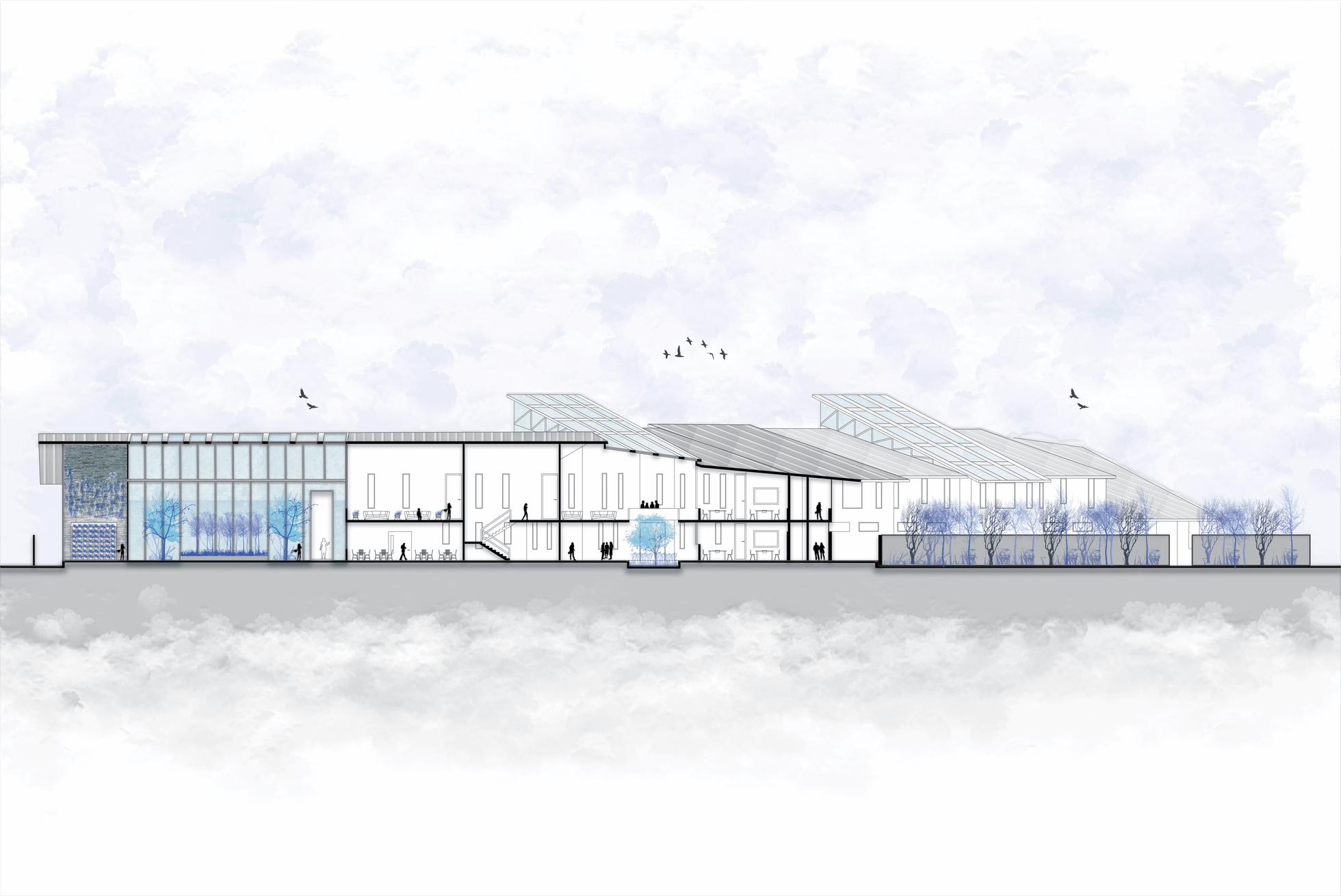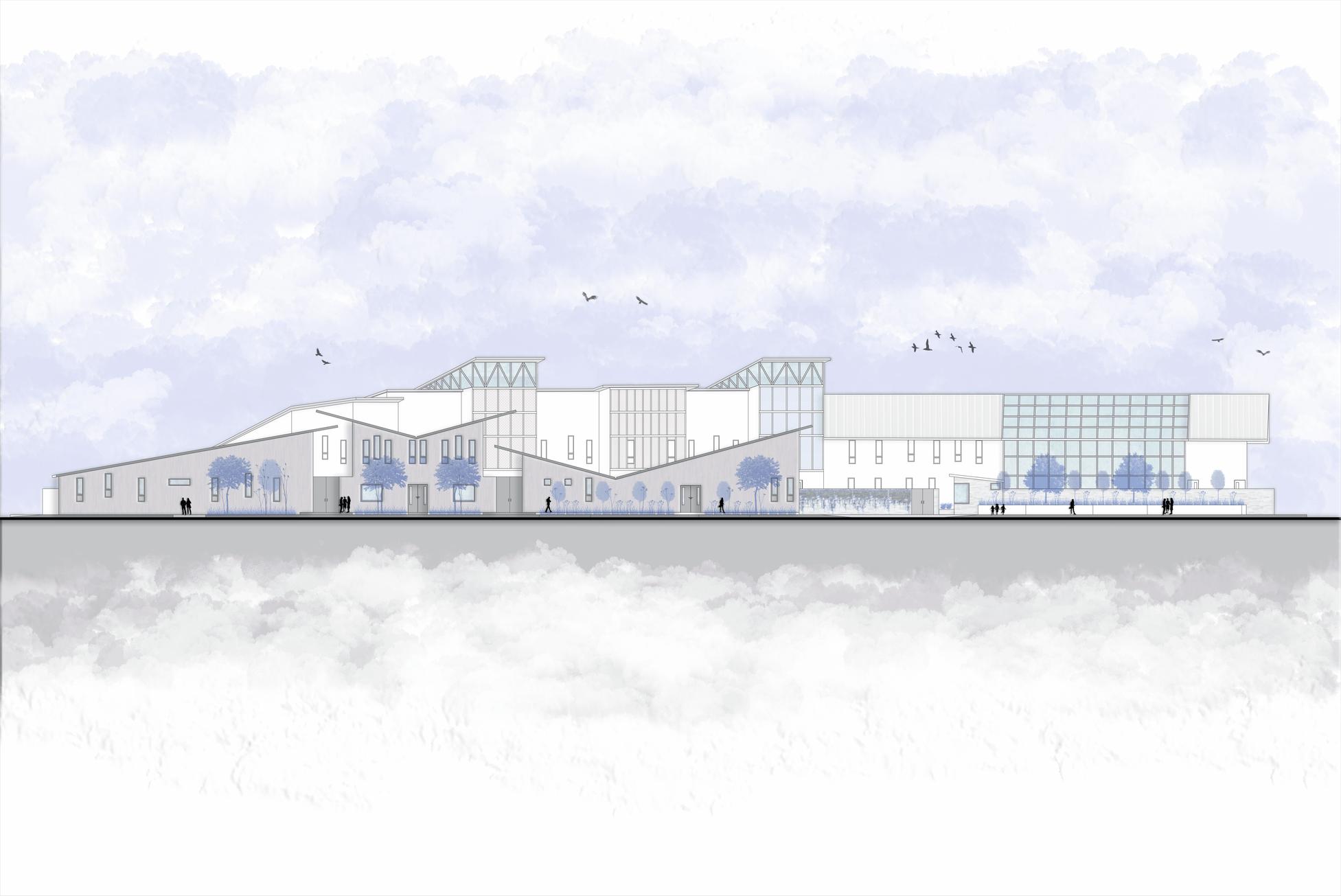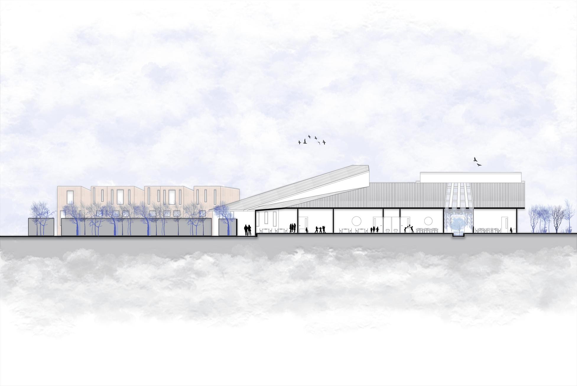 La forma del proyecto trata de envolver casi por completo al terreno, buscando protegerse de los fuertes vientos y heladas.