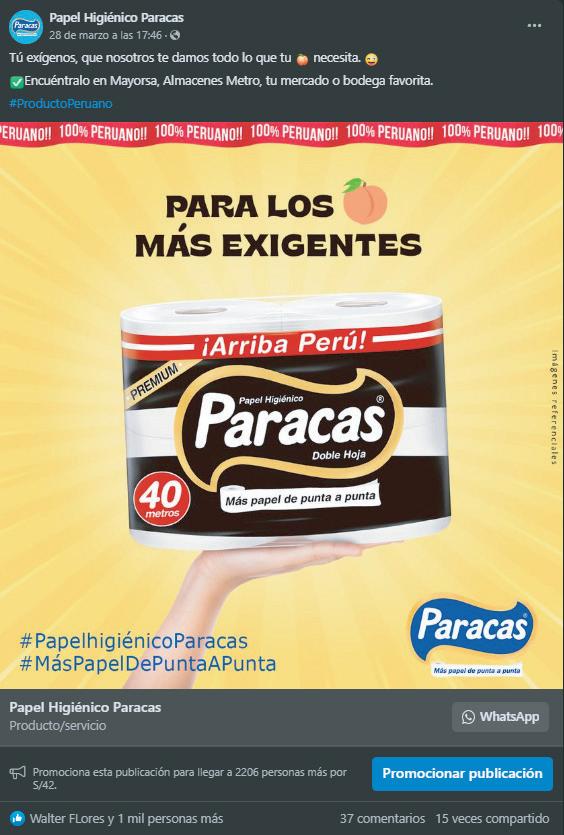 La marca Papel Higiénico Paracas, es una marca enfocada a la venta de papel higiénico en diferentes presentaciones para diferentes sectores. Por lo tanto, me encargaba de proponer ideas interesantes, graciosas pero con un mensaje claro y así poder lograr un buen engagement en las publicaciones.