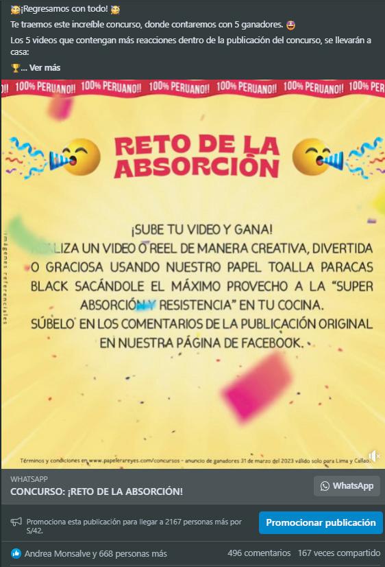 En este caso se propuso un concurso en la cual el consumidor final interactúe con la página de la marca subiendo un video usando el papel toalla Paracas y la elección de ganadores fue a través de likes por los mismos usuarios.