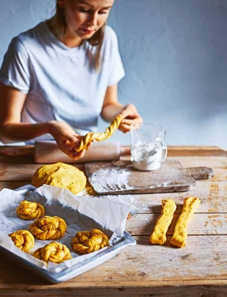3. Stjälp upp degen på ett väl mjölat bakbord och dela den i två bitar. Kavla sedan ut en bit i taget till en rektangel. Bred på hälften av fyllningen och vik sedan degen på mitten. Skär den i 2 cm breda remsor och tvinna dem. Snurra sedan ihop dem till en bulle och lägg på en plåt med bakplåtspapper. Upprepa med den andra degbiten och låt bullarna jäsa under bakduk i cirka 1 ½ timme tills de har fördubblats i storlek. Sätt ugnen på 225 grader när det är 20 minuter kvar av jästiden.