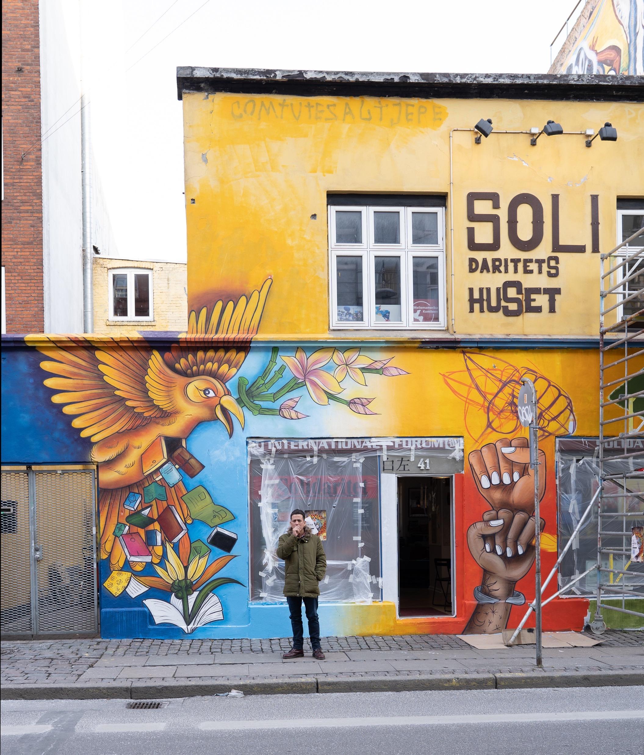 Derfor var det selvfølgelig Danilo Espinoza, Dans, der skulle udsmykke facaden. I hans arbejde er symbolikken nemlig et af de vigtigste elementer. Her, solidaritet. Han ønsker at give folk mulighed for at fortolke og opleve på deres helt egen måde. Og derigennem reflektere over de budskaber, der måtte ligge i kunsten.