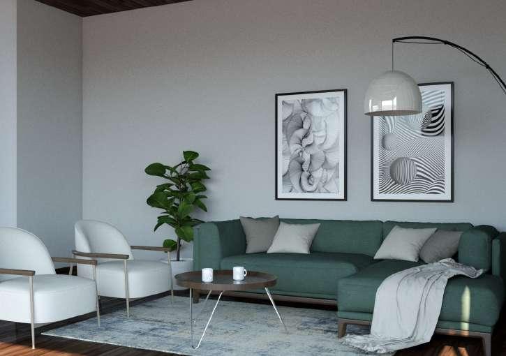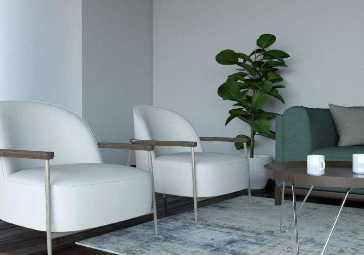 Render de Sala de estar del estilo moderno. Este espacio esta diseñado para dar una sensación de calma y tranquilidad. Las líneas rectas, los colores claros y la ausencia de ornamentos son algunos de las características que nos transmiten orden y serenidad.