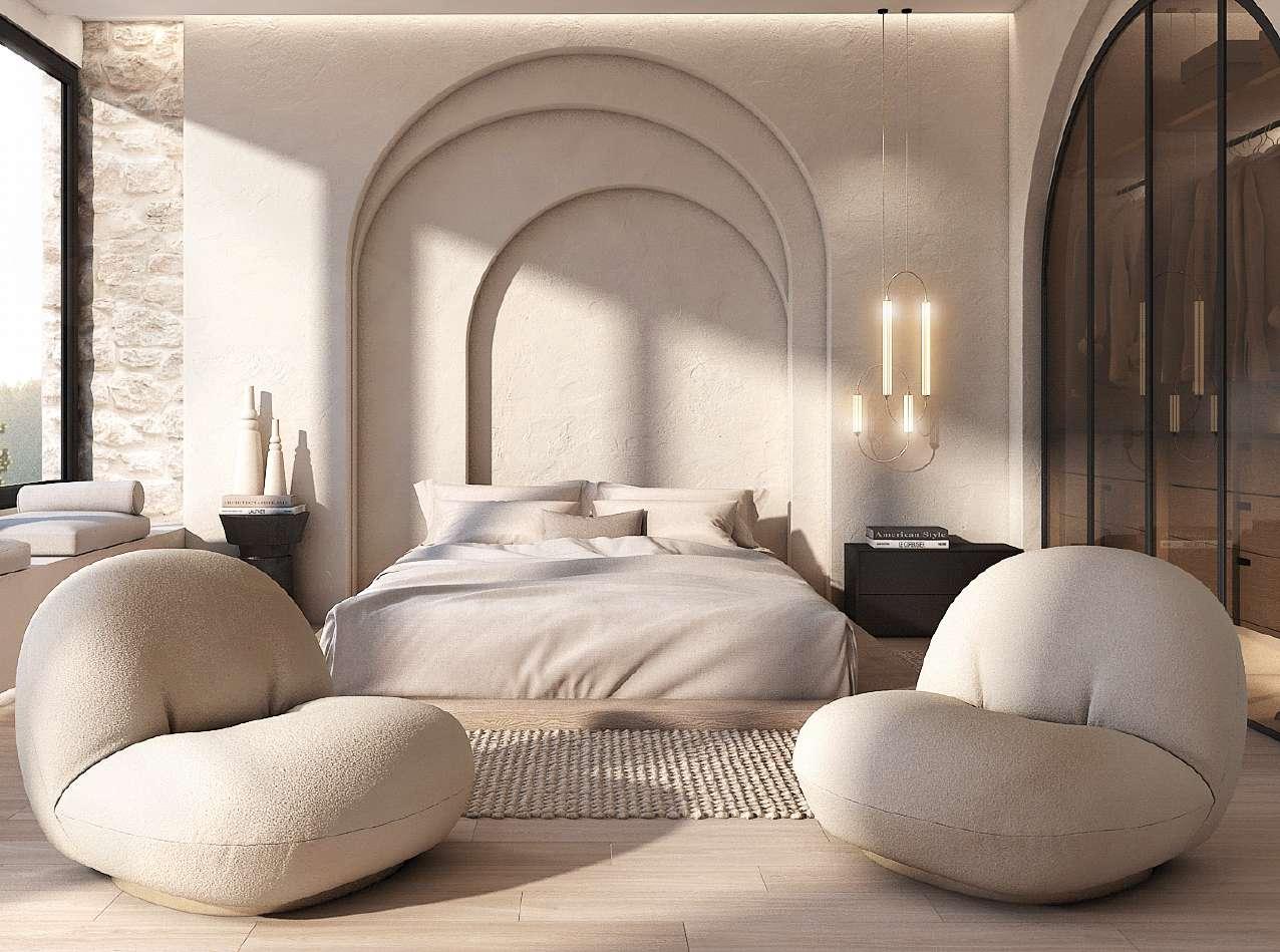 Recamara principal con estilo mediterráneo, con una sensación al mar y el océano, gracias a los colores y a las connotaciones. Entre los materiales que componen el espacio están la madera, el yeso, el hierro forjado, el lino, el mimbre y la piedra