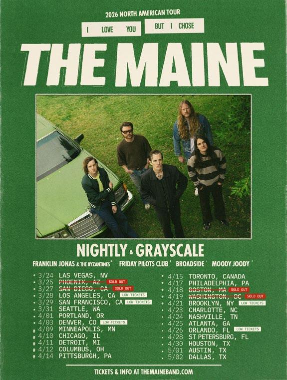 With their album Joy Next Door on the way, The Maine has kicked off their I LOVE YOU BUT... I CHOSE THE MAINE TOUR on March 24. Nightly and Grayscale will join the entire tour, while Franklin Jonas, Friday Pilots Club, Broadside, and Moody Joody will join select dates.