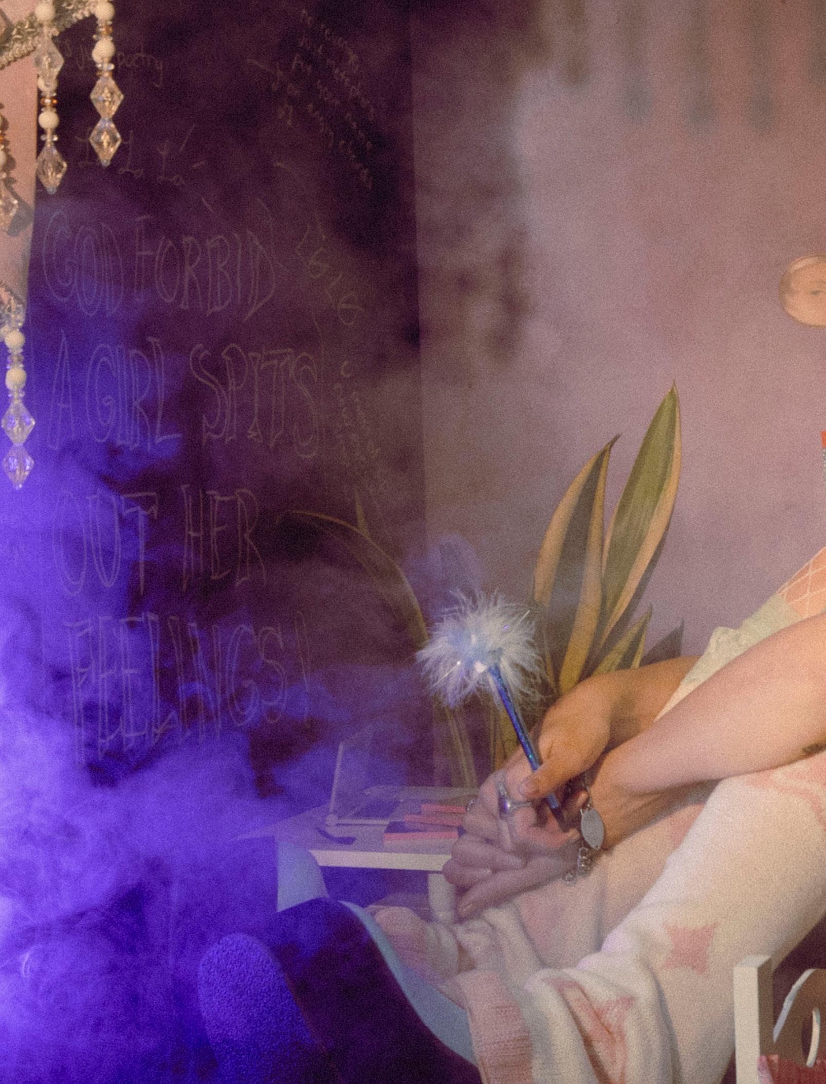 That shift became god forbid a girl spits out her feelings!, out April 17 via Fearless Records. The record is a stripped-back unraveling of everything she once tried to hide. “Every song is diaristic, ripped straight from the pages of my journal, chronicling every intrusive or delusional thought, every downward spiral that goes on in the labyrinth I call my mind,” she says. “It’s me, spilling my guts in real time to cope.”