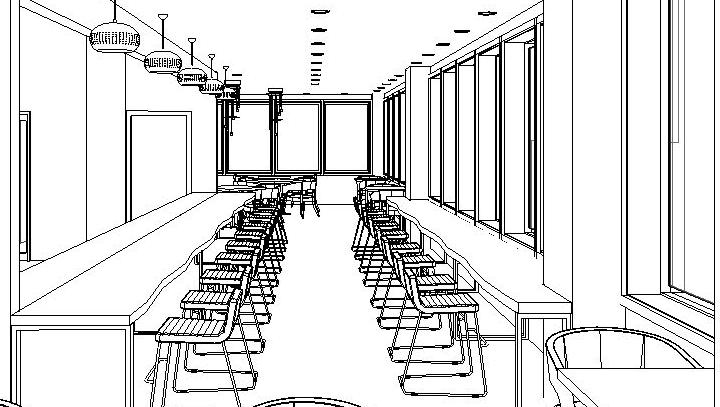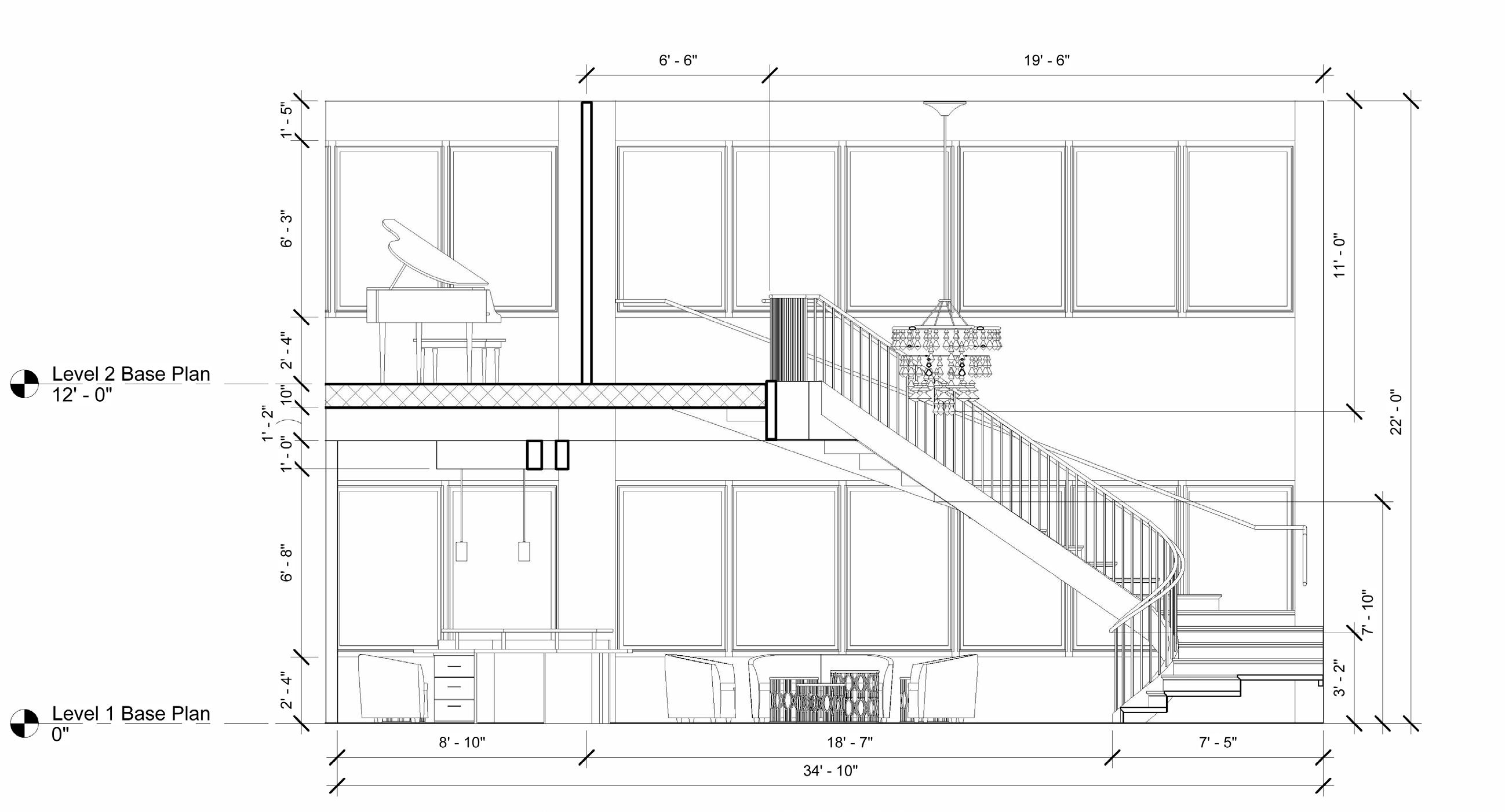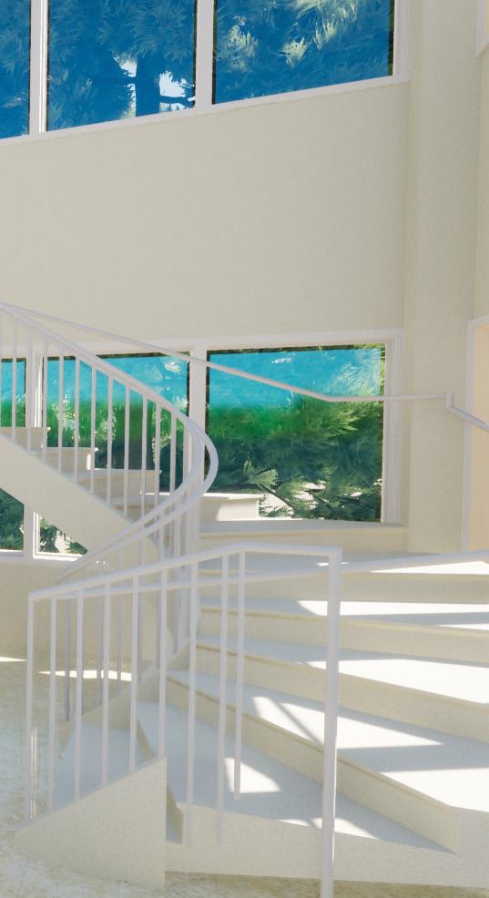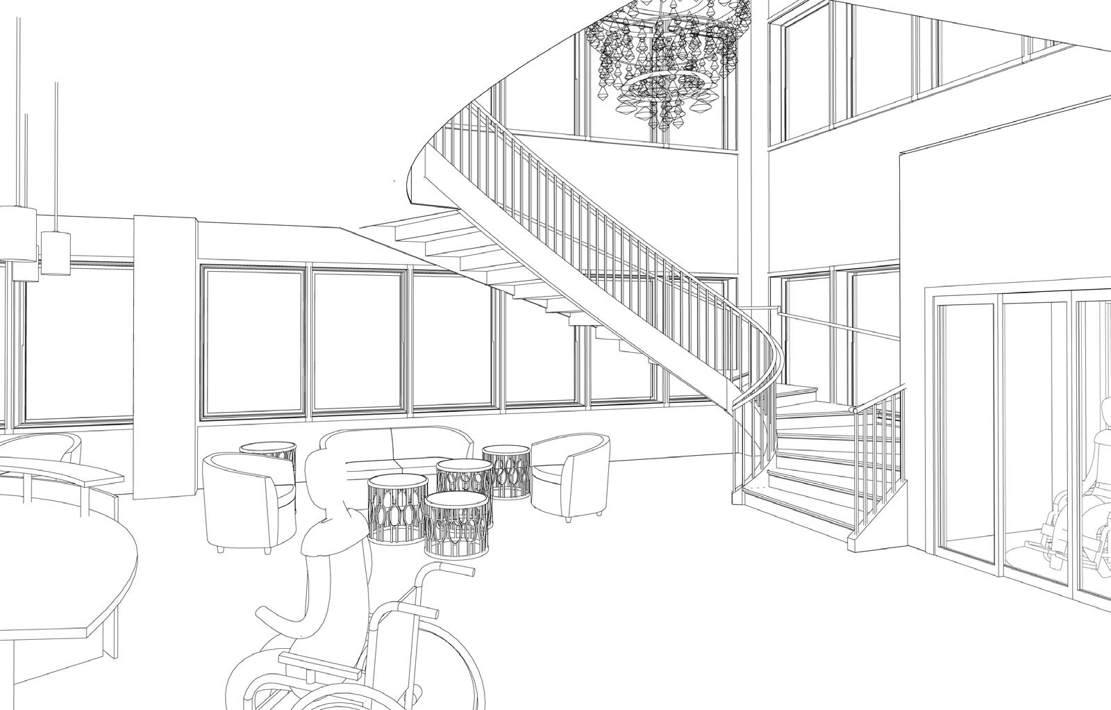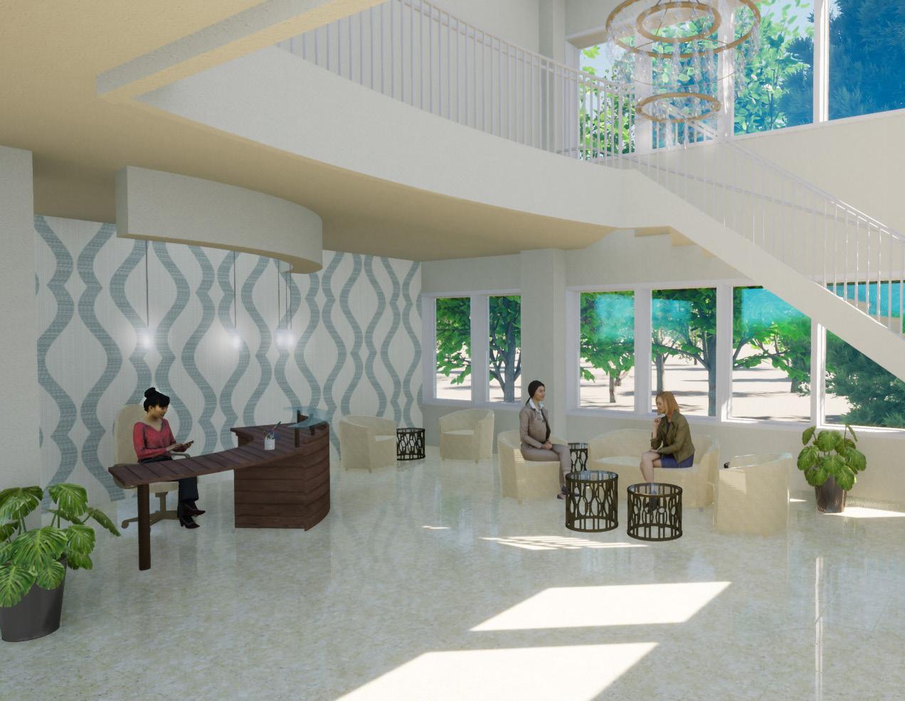 Computer Sketching to achieve a lobby that is accurate to scale and code compliant. At this point, a curve has been added to the staircase to increase a feeling of granduer. The addition of furniture, lighting, and accessories to indicate ease of travel.