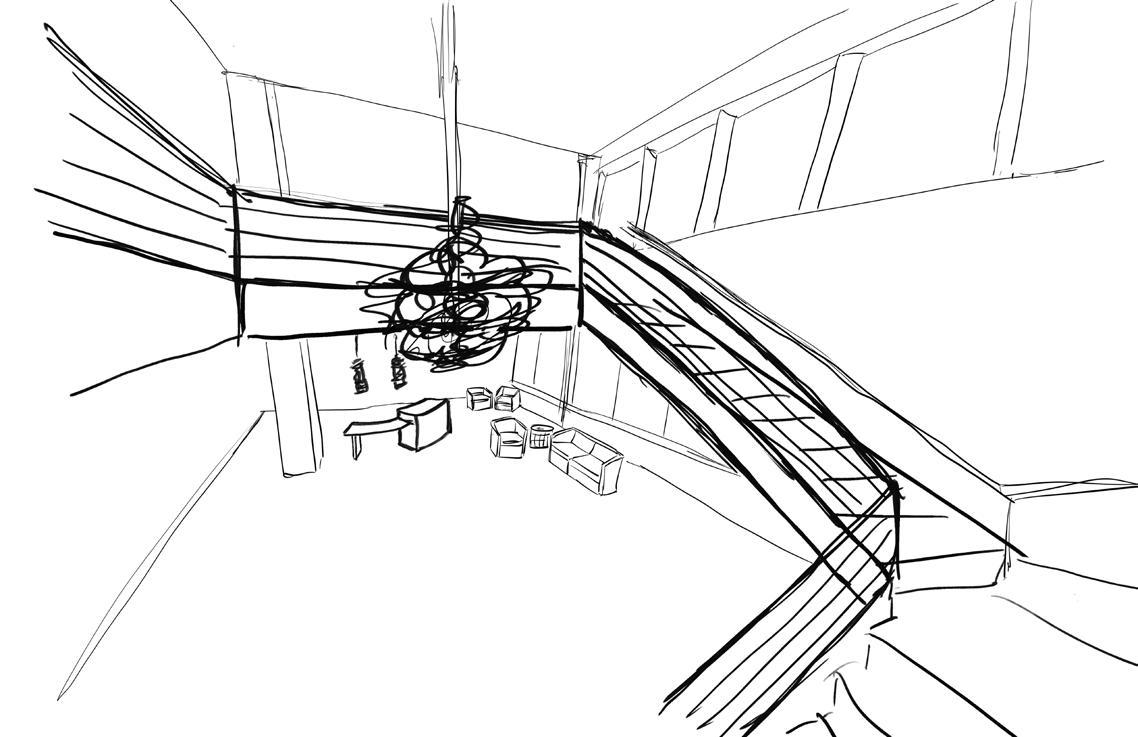 Sketching for ideation. A large grand staircase in the lobby will create an unstated elegance the client is looking to achieve in the new facility. It is open to the second floor allowing for a large chandelier to further enhance the feeling of sophistication.